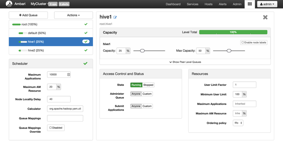yarn.scheduler.capacity.root.queues=hive1,hive2 yarn.scheduler.capacity.root.hive1.capacity=50 yarn.scheduler.capacity.root.hive2.capacity=50