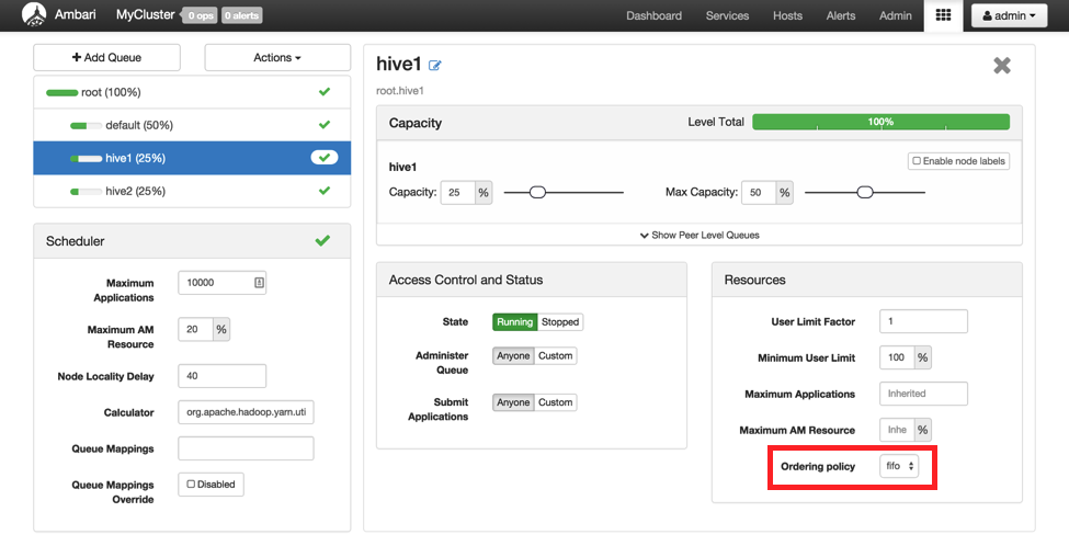 Fair scheduling is specified by setting Ordering policy to fair in the Capacity Scheduler View in Ambari, shown in the following figure. This is supported in HDP 2.3 and later. To manually set this in the capacity-scheduler.xml file, see the YARN Resource Management Guide.
