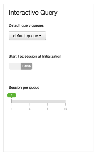 Hive configuration in the Interactive Query pane of the Hive configuration page in Ambari enables choosing a set of default queues for the interactive queries. This pane also enables you to initialize Tez sessions per session and choose sessions per queue: