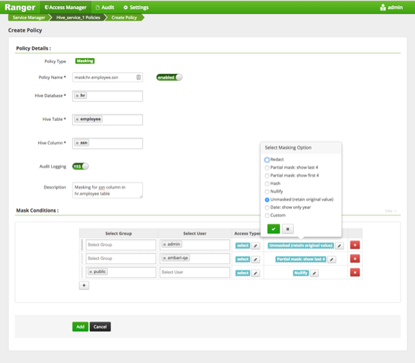 Dynamic column masking policies are similar to other Ranger access policies for Hive. You can set filters for specific users, groups, and conditions. With dynamic column-level masking, sensitive information never leaves Hive, and no changes are required at the consuming application or the Hive layer. There is also no need to produce additional protected duplicate versions of datasets.