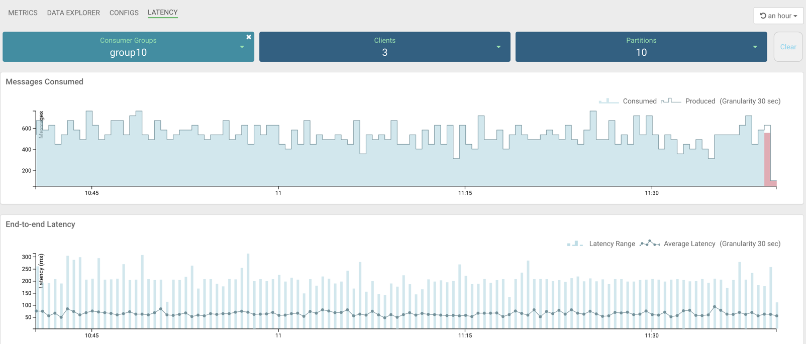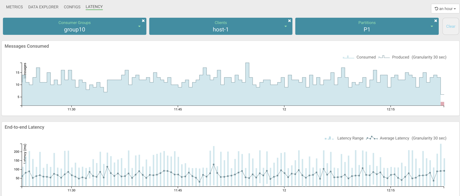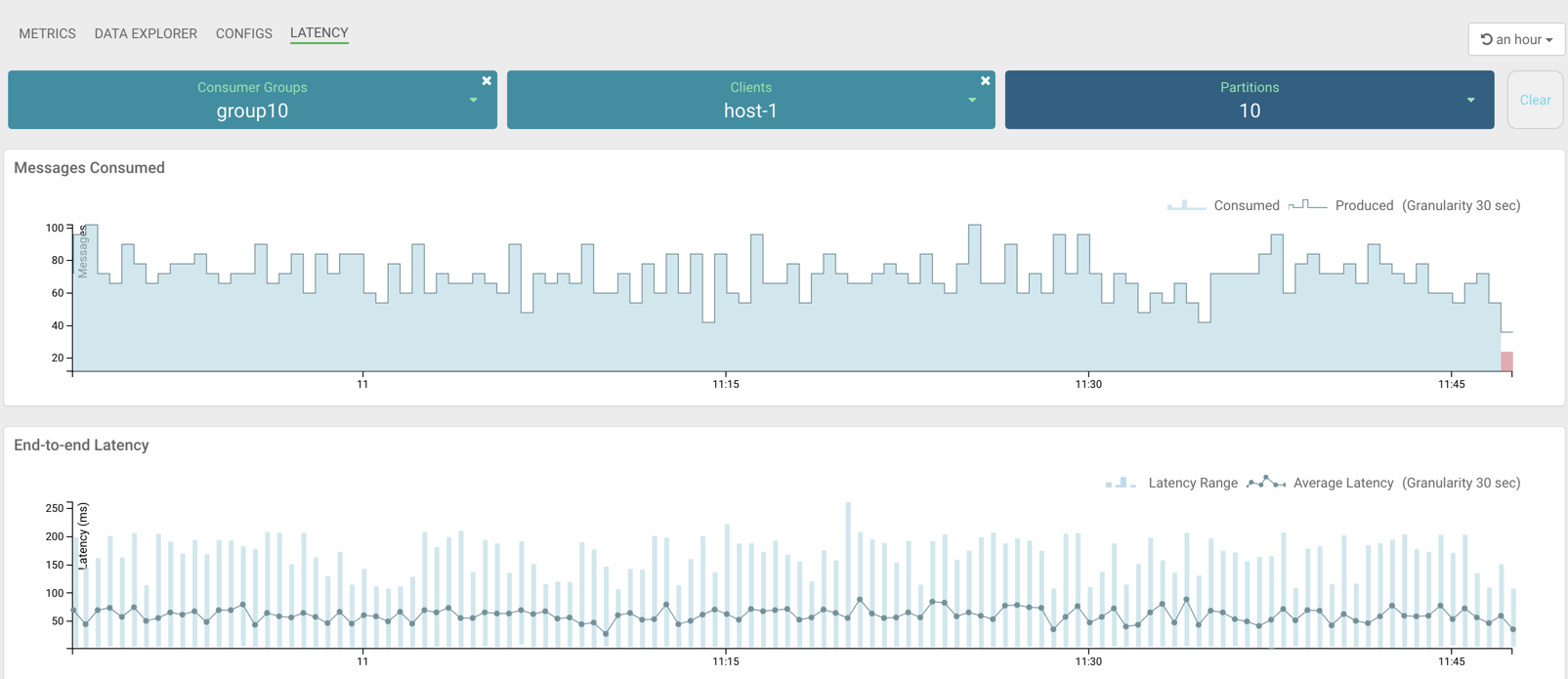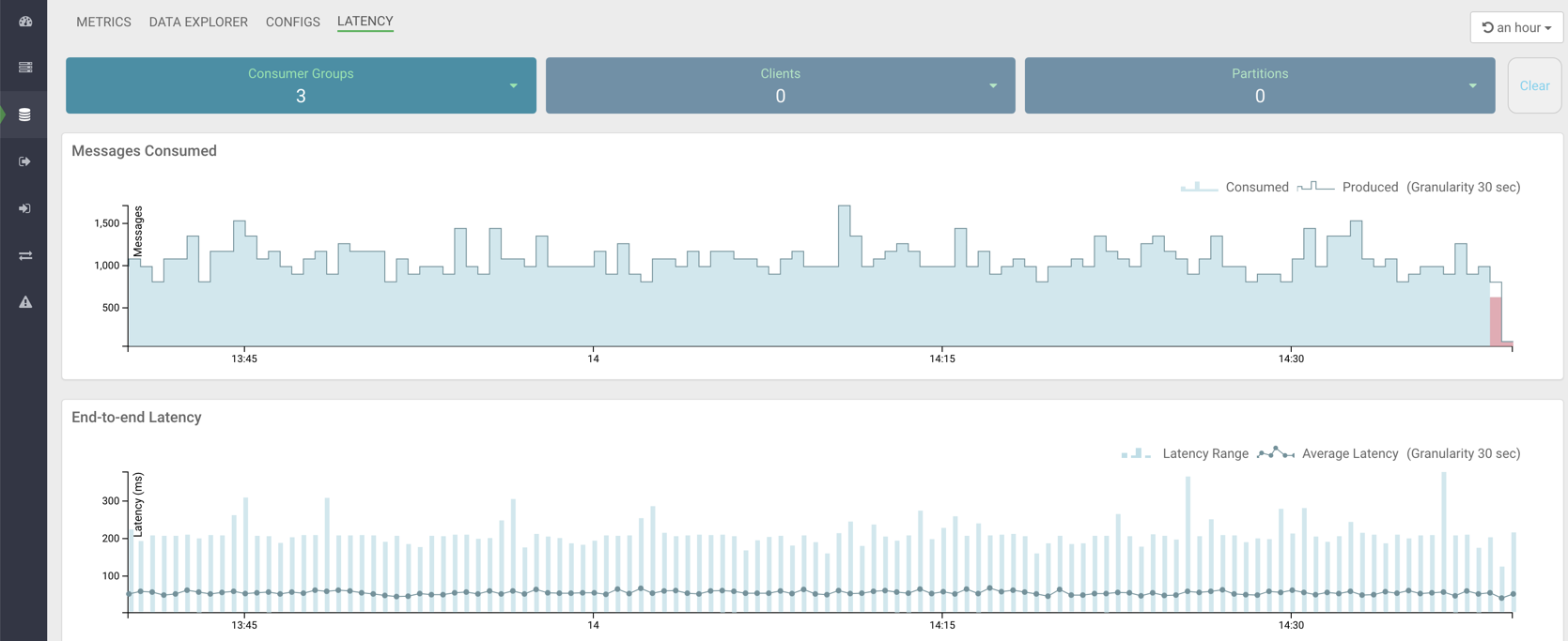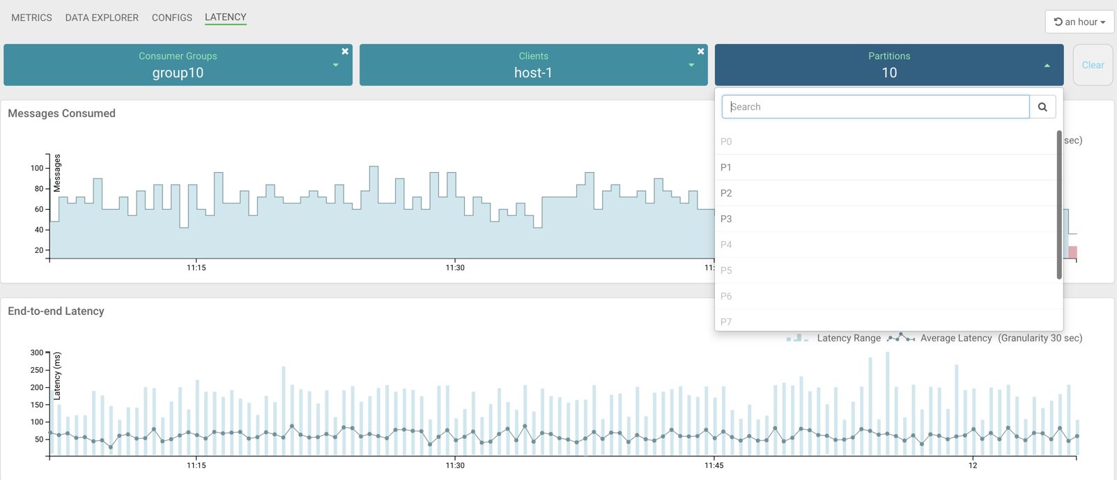 The Latency view gives you a powerful snapshot of the end-to-end latency scenario: number of consumer groups for a topic, number of clients inside a particular consumer group, and number of partitions in a topic along with the