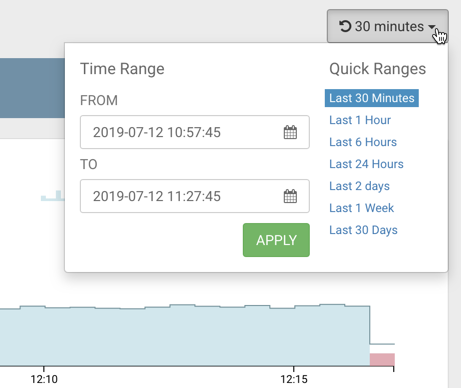 To select a different time range, use the Time Range and Quick Ranges options at the top-right corner of the page, as shown in the following image: