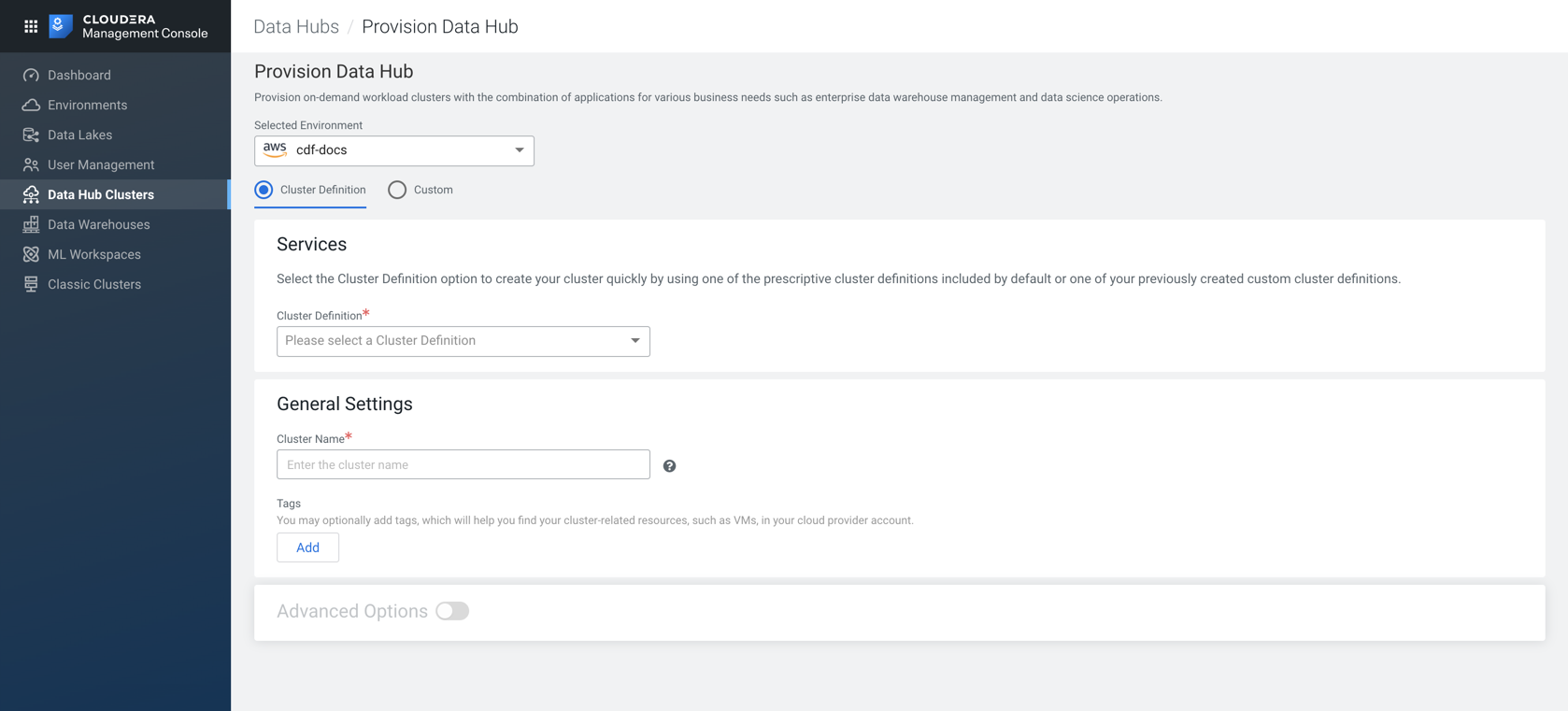 cluster in CDP Public Cloud using a default cluster definition. For this, you must select the