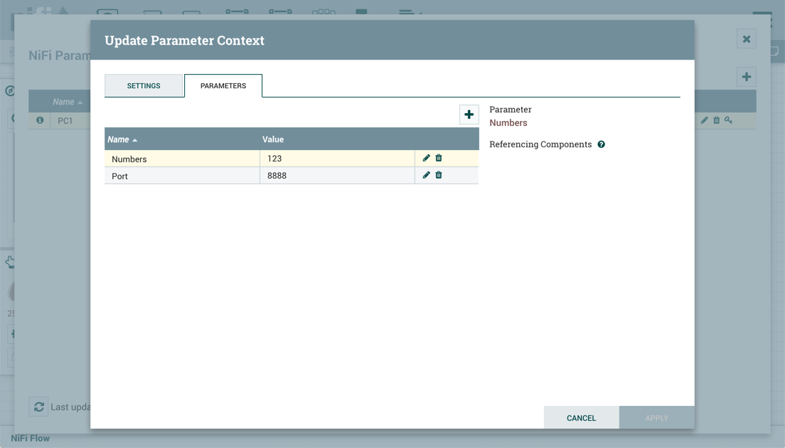 A flow has a Parameter Context "PC1" with the following parameters: