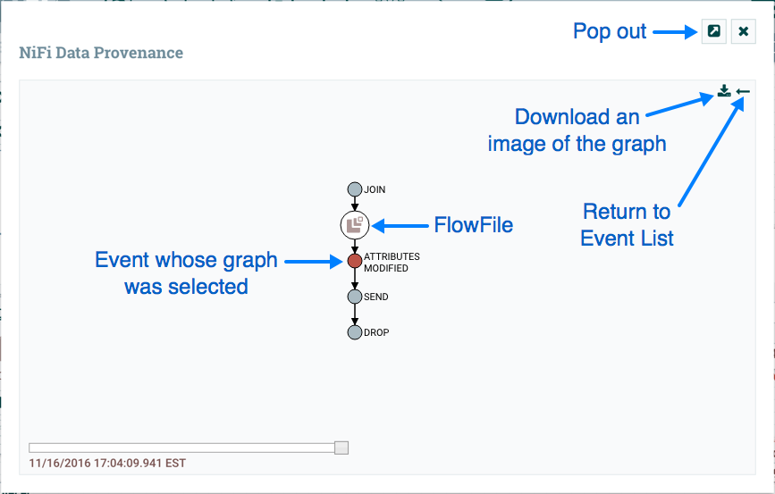 It is often useful to see a graphical representation of the lineage or path a FlowFile took within the dataflow. To see a FlowFile's lineage, click on the "Show Lineage" icon ( ) in the far-right column of the Data Provenance table. This opens a graph displaying the FlowFile ( ) and the various processing events that have occurred. The selected event will be highlighted in red. It is possible to right-click or double-click on any event to see that event's details (see Details of an Event). To see how the lineage evolved over time, click the slider at the bottom-left of the window and move it to the left to see the state of the lineage at earlier stages in the dataflow.