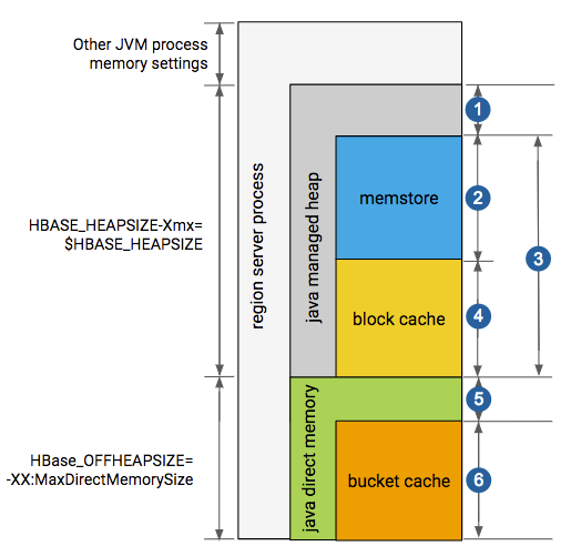 hbase.regionserver.global.memstore.size: default is 0.4, which means 40%hbase.regionserver.global.memstore.size+hfile.block.cache.size≤0.80, which means 80%hfile.block.cache.size: default is 0.4 which means 40%- slack reserved for HDFS SCR/NIO: number of open HFiles *