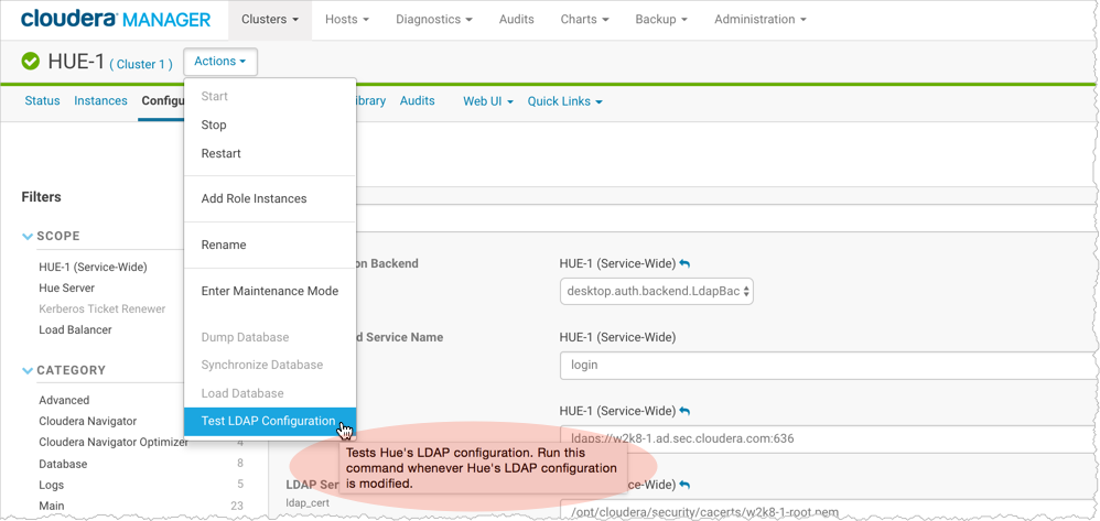 You can test your Hue LDAP configuration without restarting the Hue service. Add the values and save your changes.