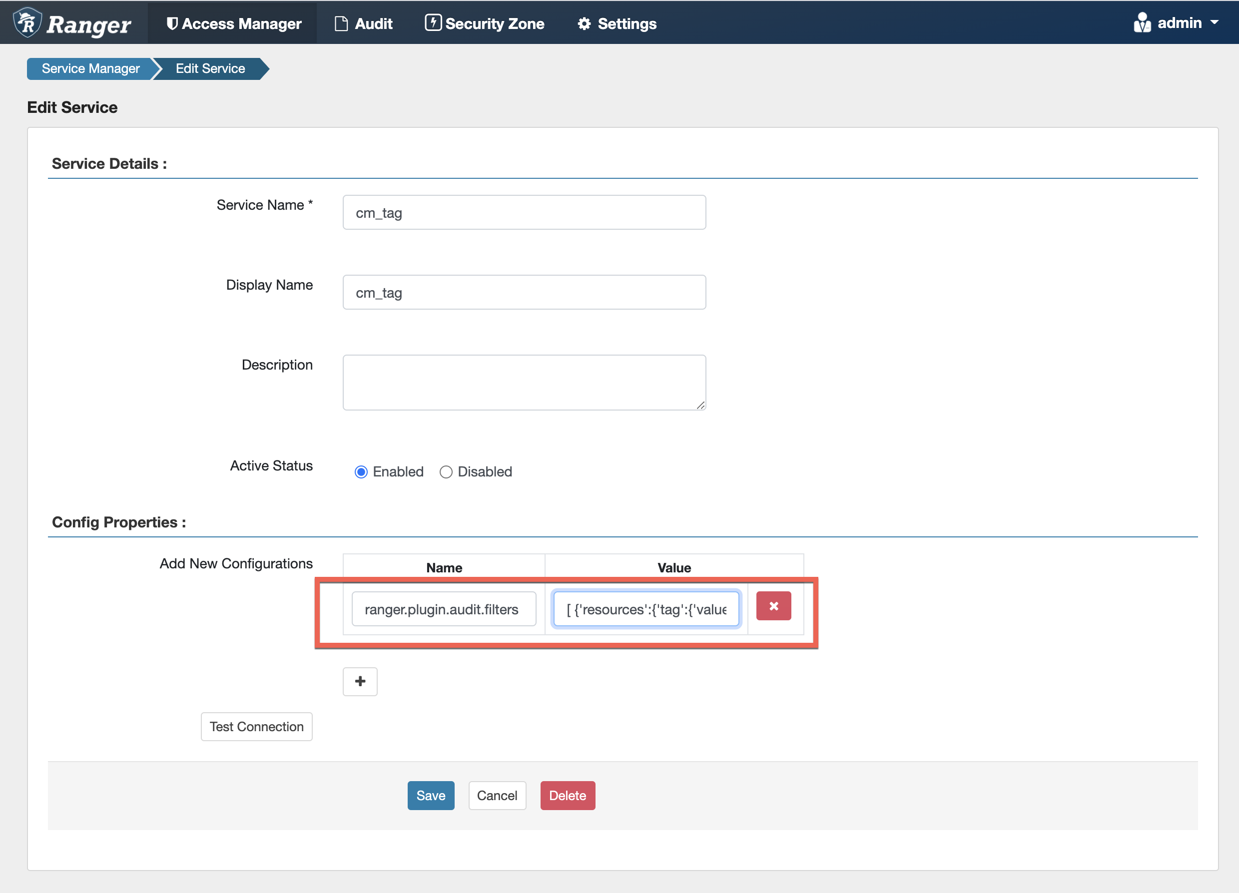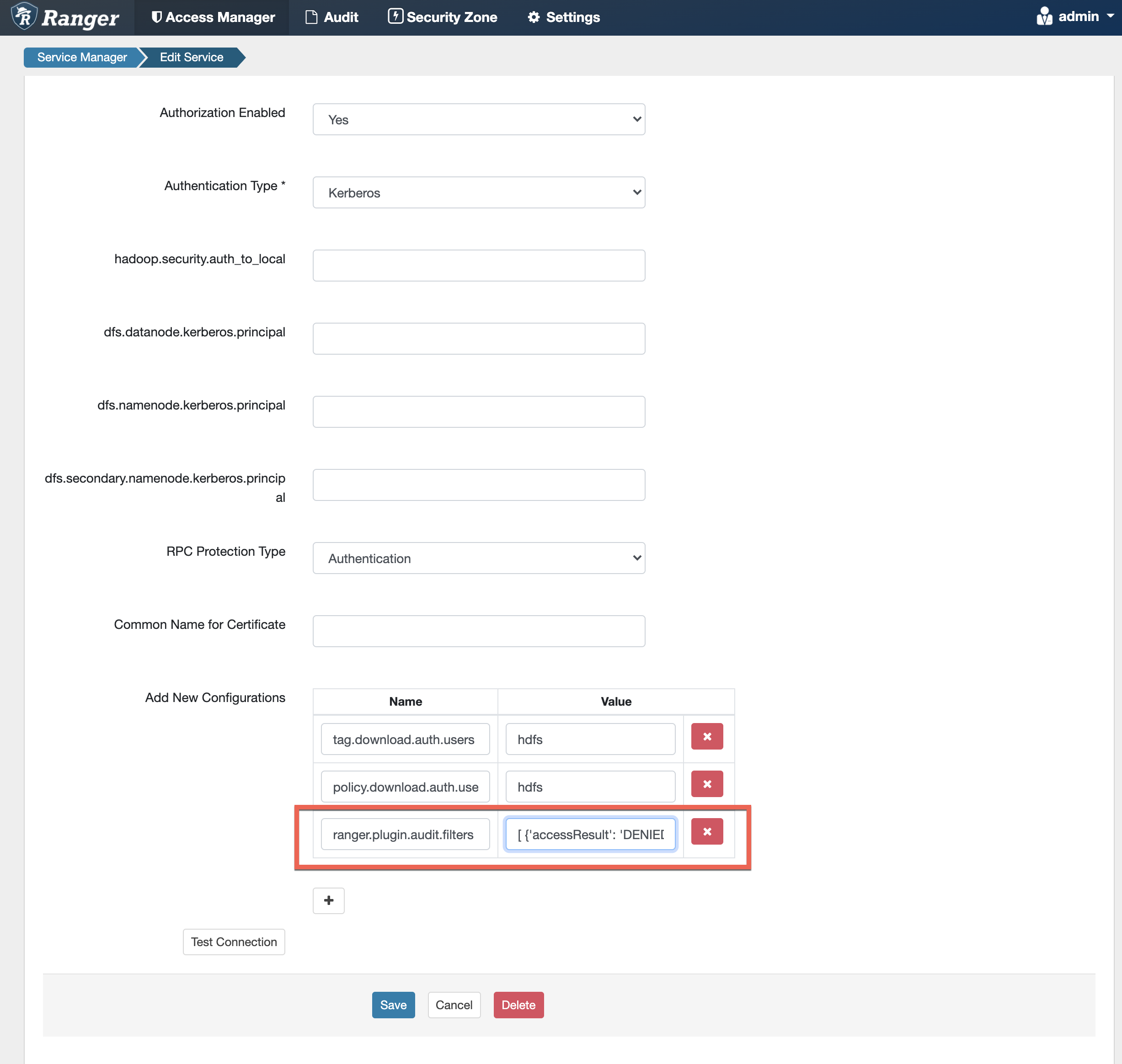 ranger.plugin.audit.filtersis already set in the Name box in the UI. For the HDFS example above, you would enter:[ {'accessResult': 'DENIED', 'isAudited': true}, {'users': ['unaudited-user1'], 'groups': ['unaudited-group1'], 'roles':['unaudited-role1'], 'isAudited': false}, {'actions': [ 'listStatus', 'getfileinfo' ], 'accessTypes':['execute'], 'isAudited': false}, {'resources':{'path':{'values':['/audited'],'isRecursive':true}}, 'isAudited': true}, {'resources':{'path':{'values':['/unaudited'],'isRecursive':true}},'isAudited': false} ] - Each value in the list is an audit filter, which takes the format of a simplified Ranger policy, along with access results fields.