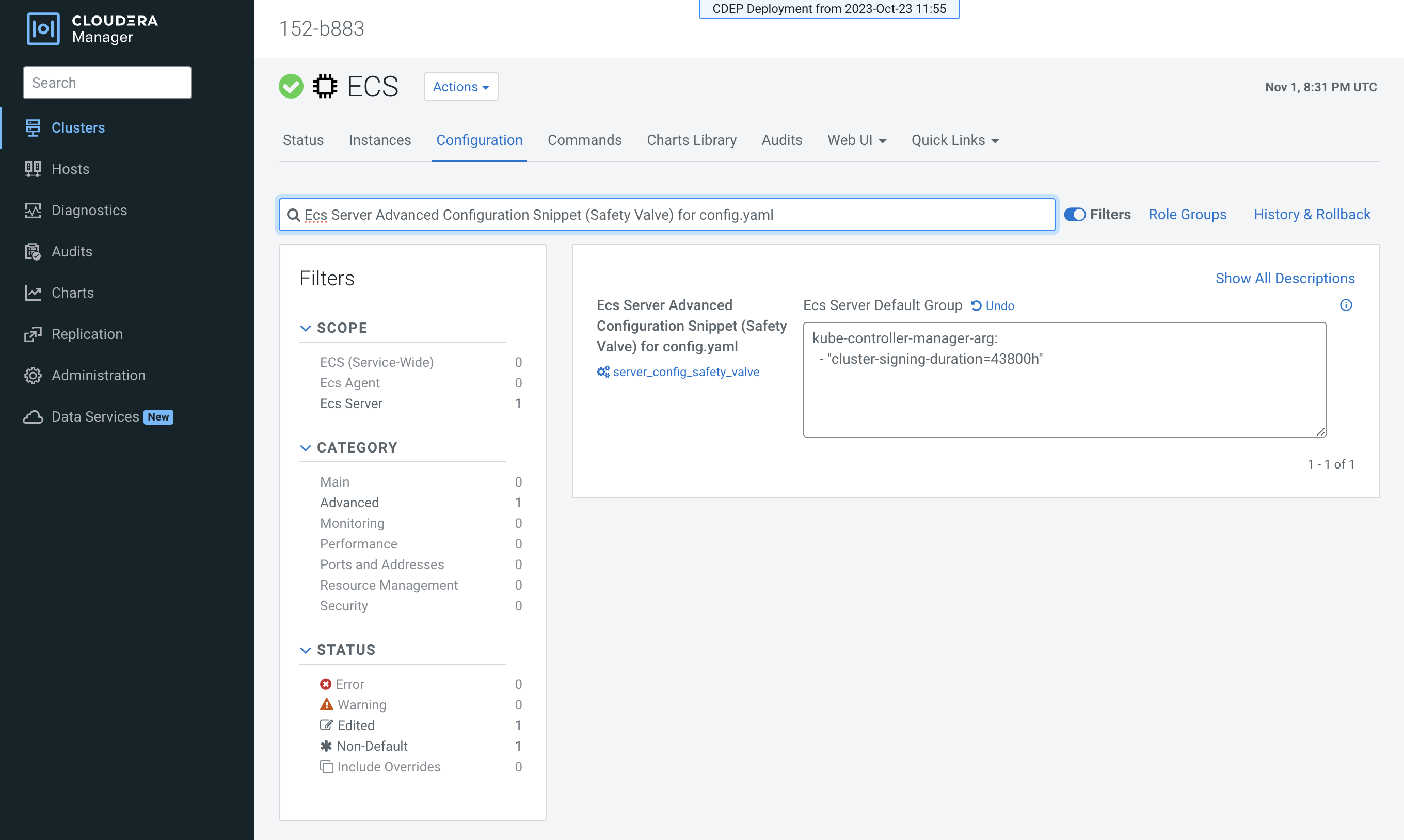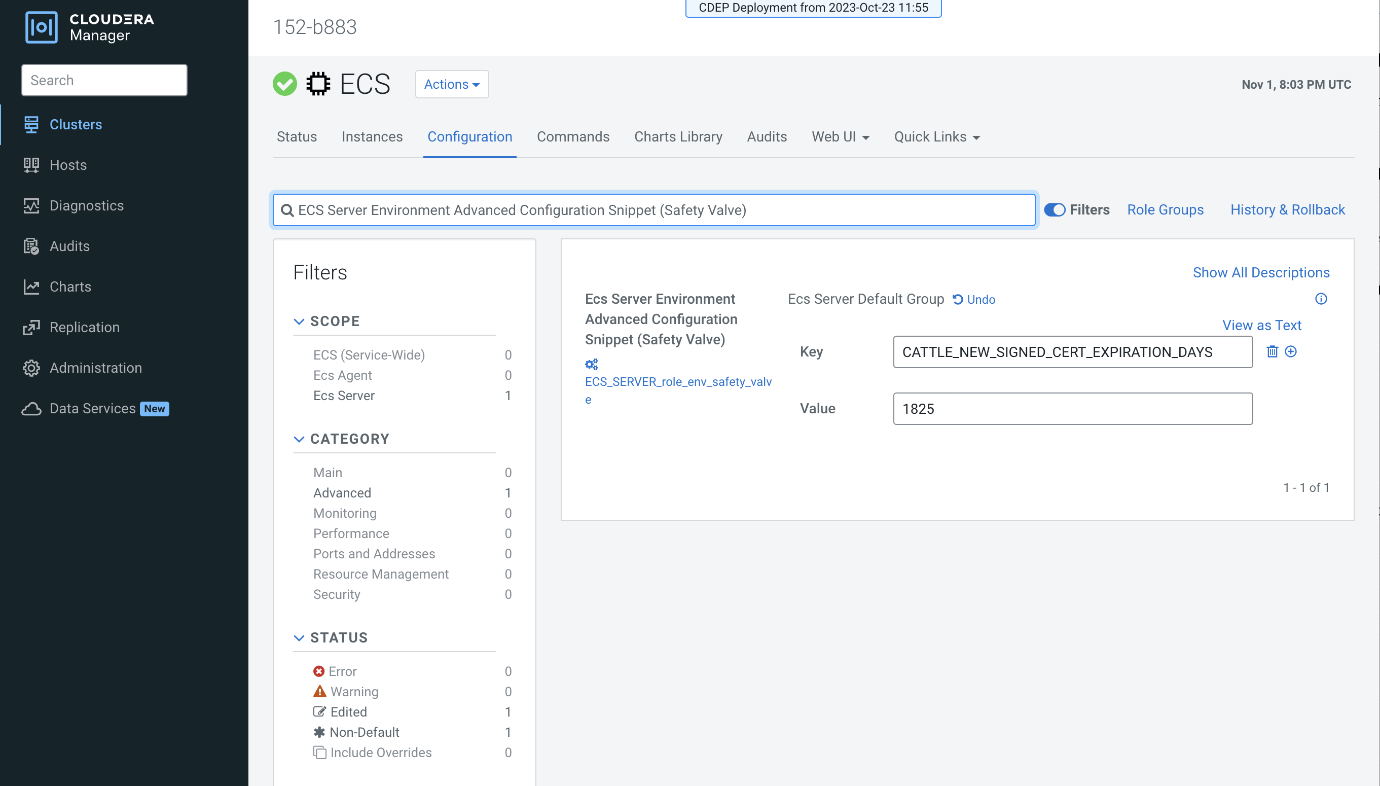Ecs Server Advanced Configuration Snippet (Safety Valve) for config.yamlconfiguration property. - Enter the following configuration setting. In this example, the certificate expiration