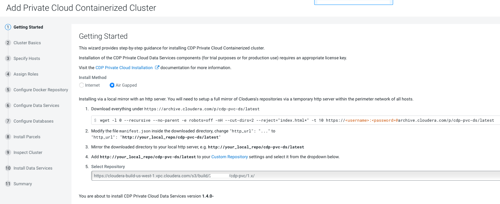 If you select the Air Gapped install option, extra steps are displayed. Follow these steps to download and mirror the Cloudera archive URL using a local HTTP server.
