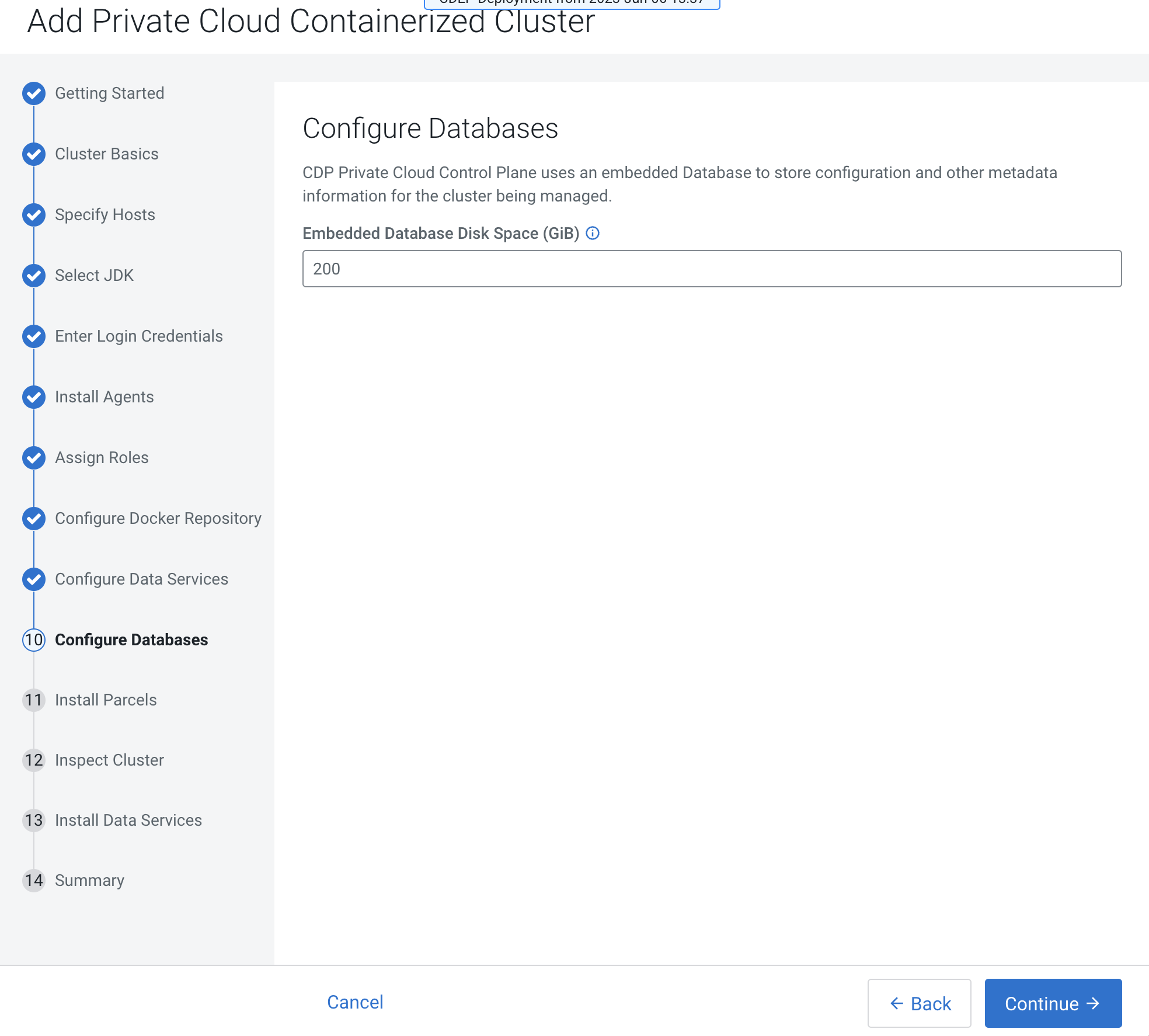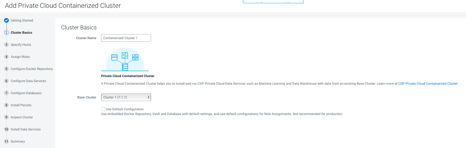 The Add Private Cloud Containerized Cluster page appears. Click Continue.
