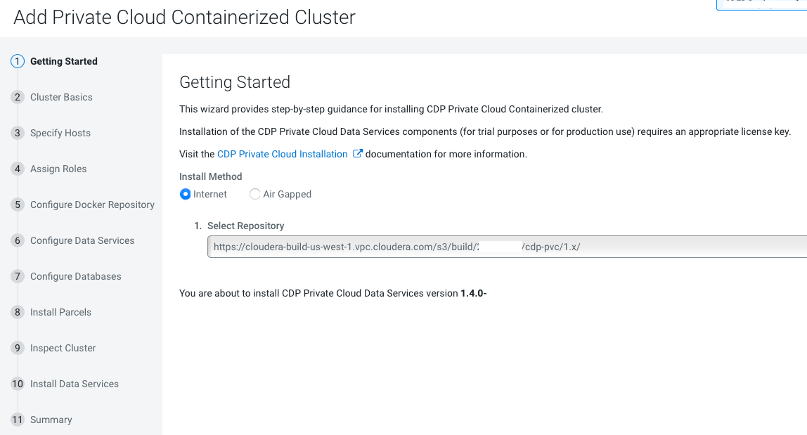 If you select the Internet Install Method option on the Getting Started page, images are copied over the internet from the Cloudera repository.