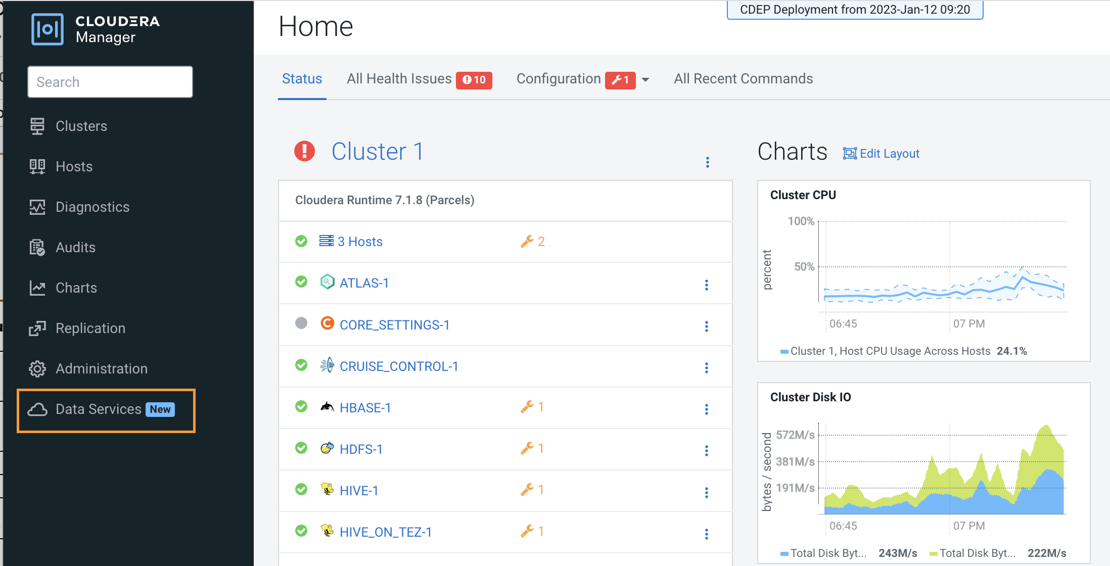 3. In Cloudera Manager, click Data Services in the left menu.