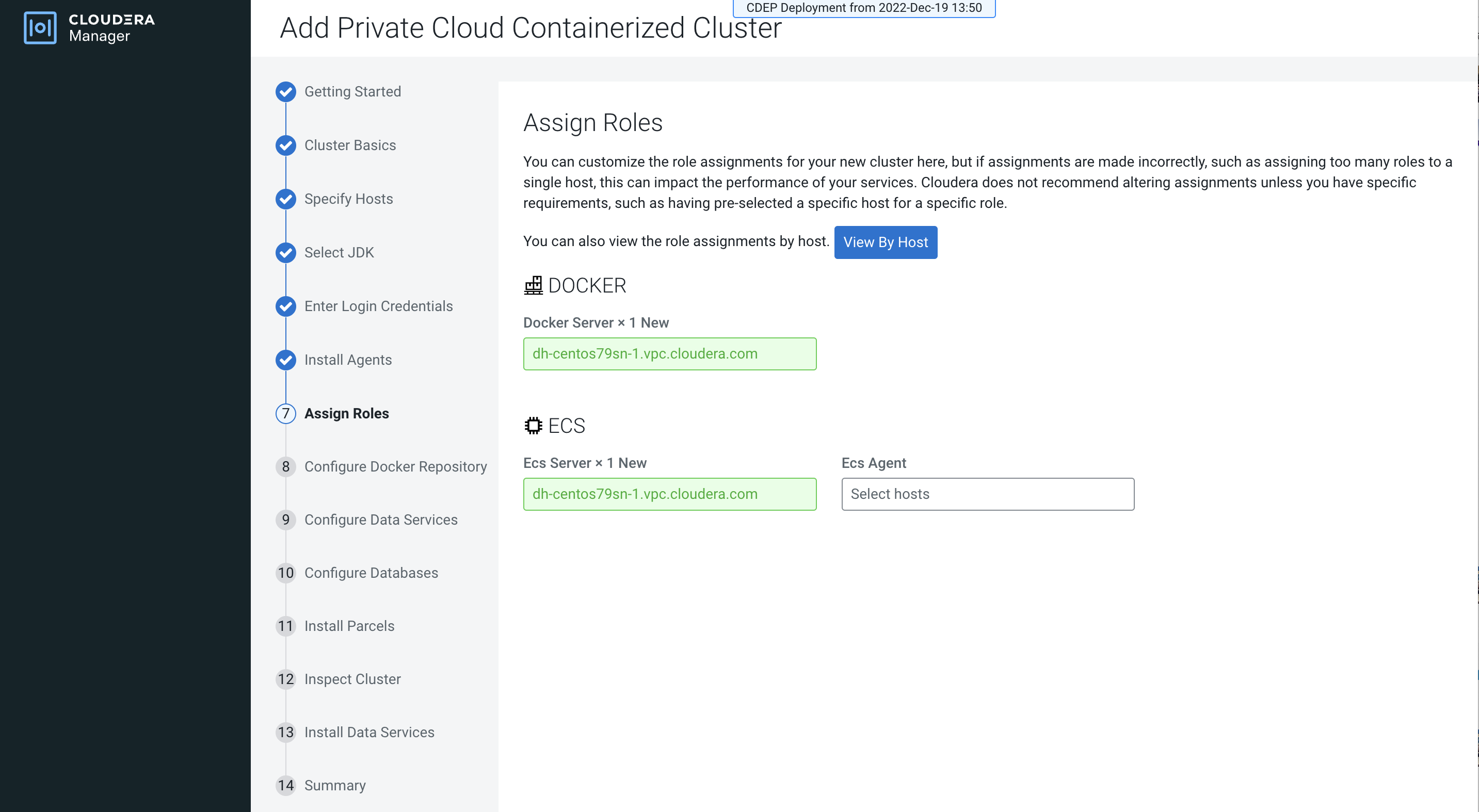 1. Add the hosts you intend to use for ECS to Cloudera Manager, without specifying a cluster. See Add New Hosts To Cloudera Manager.