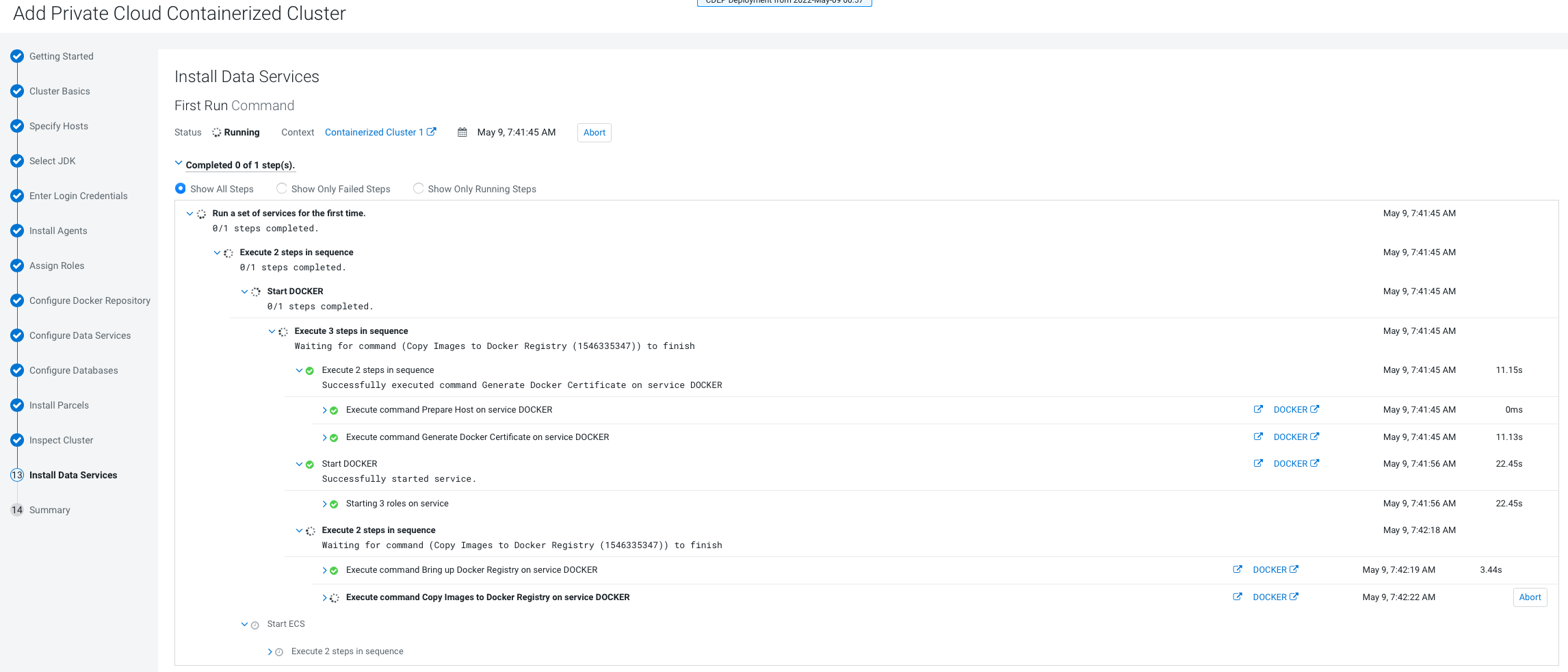 16. The installation progress is displayed on the Install Data Services page.