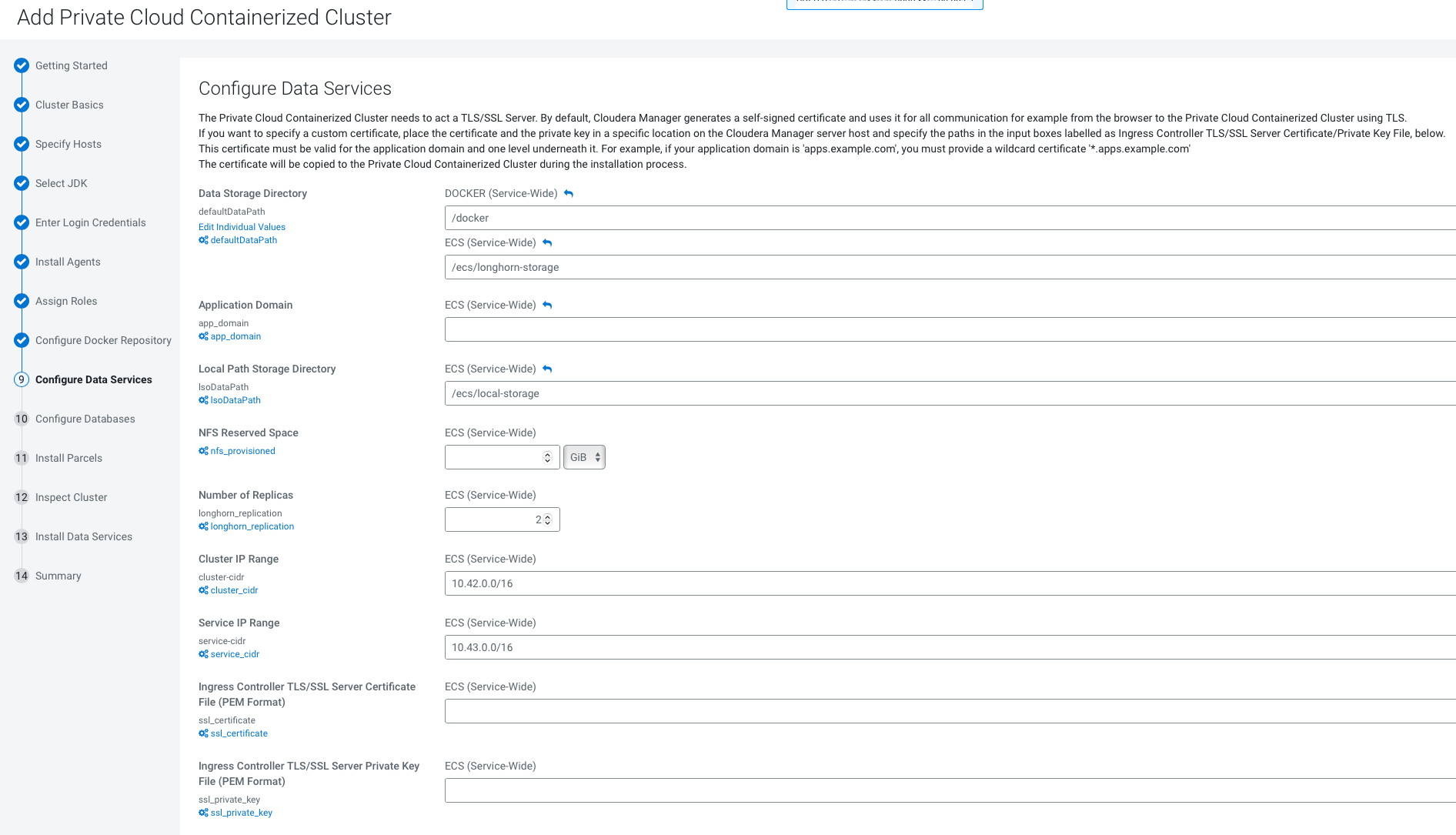 12. On the Configure Data Services page, you can modify configuration settings such as the data storage directory, number of replicas, and so on. If there are multiple disks mounted on each host with different characteristics (HDD and SSD), then Local Path Storage Directory must point to the path belonging to the optimal storage. Ensure that you have reviewed your changes. If you want to specify a custom certificate, place the certificate and the private key in a specific location on the Cloudera Manager server host and specify the paths in the input boxes labelled as Ingress Controller TLS/SSL Server Certificate/Private Key File below. This certificate will be copied to the Control Plane during the installation process.