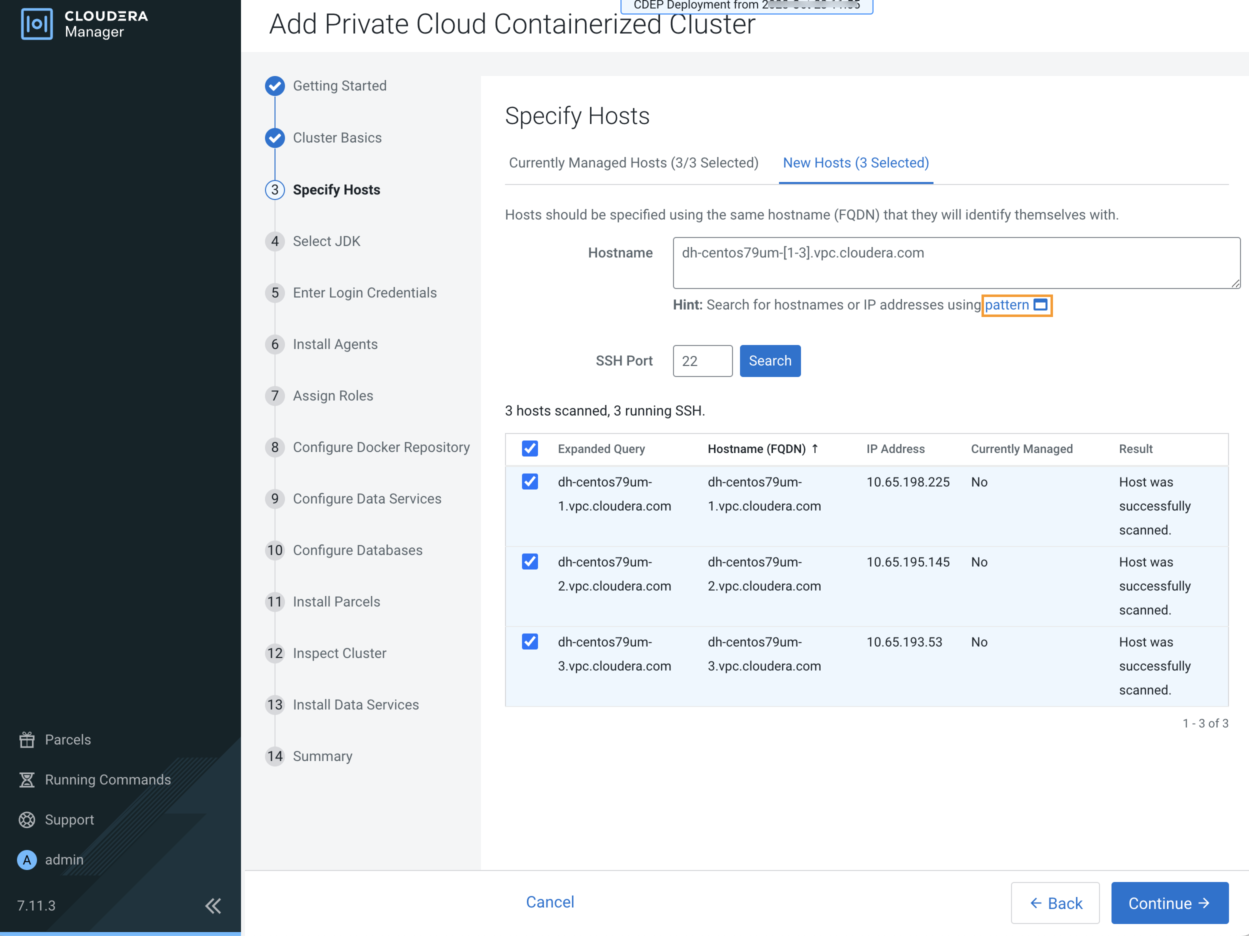 After you have finished specifying the ECS hosts, click Continue.