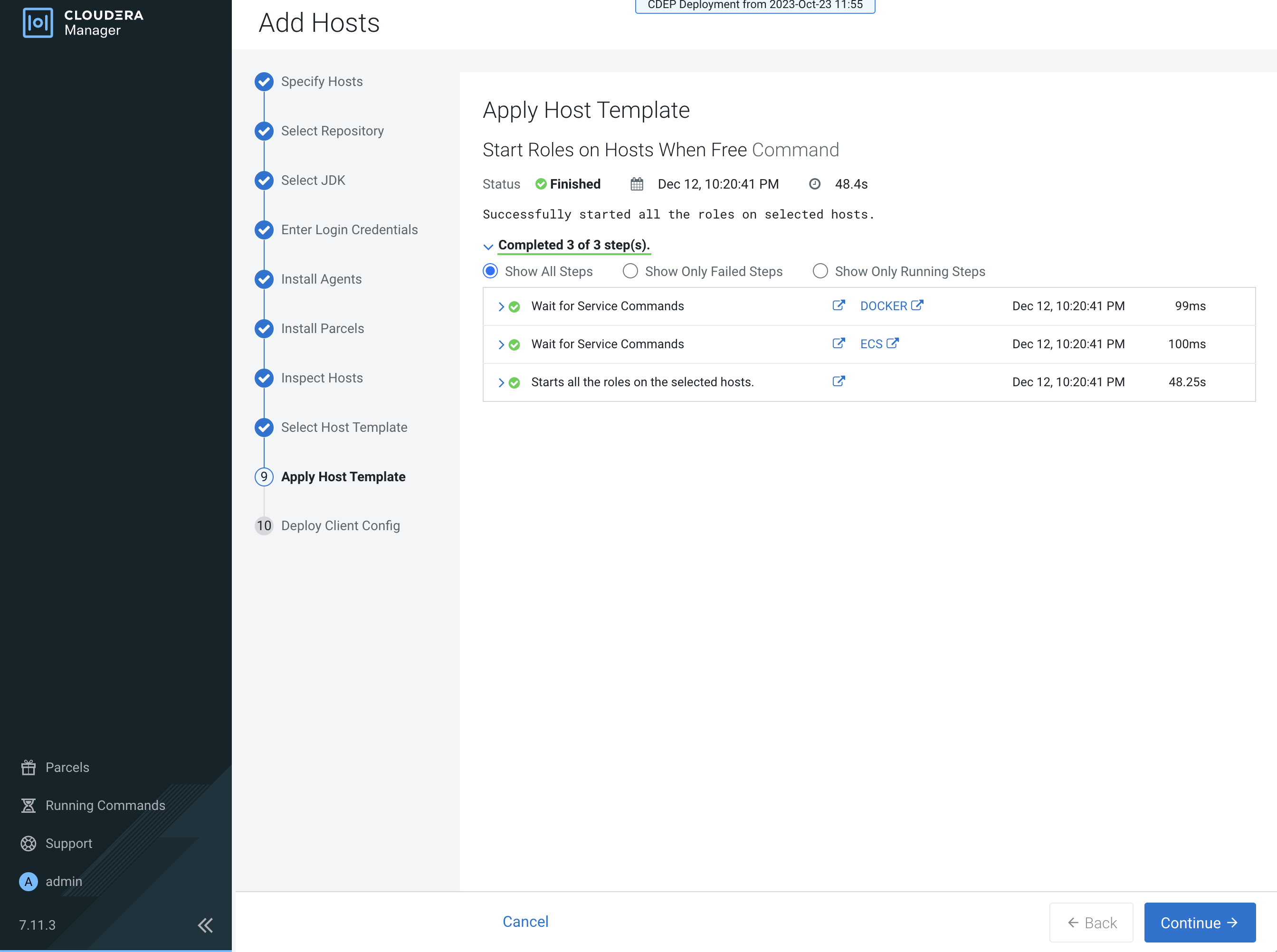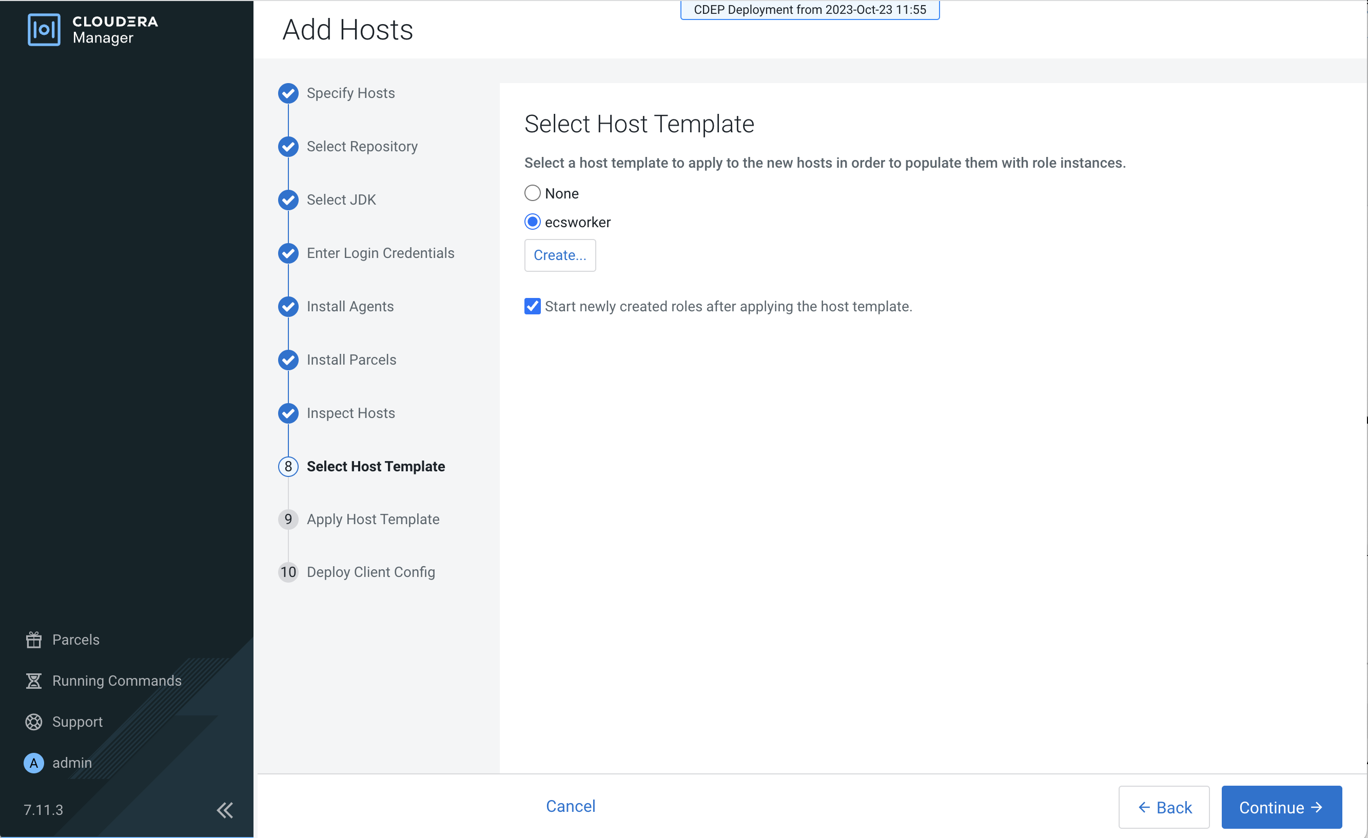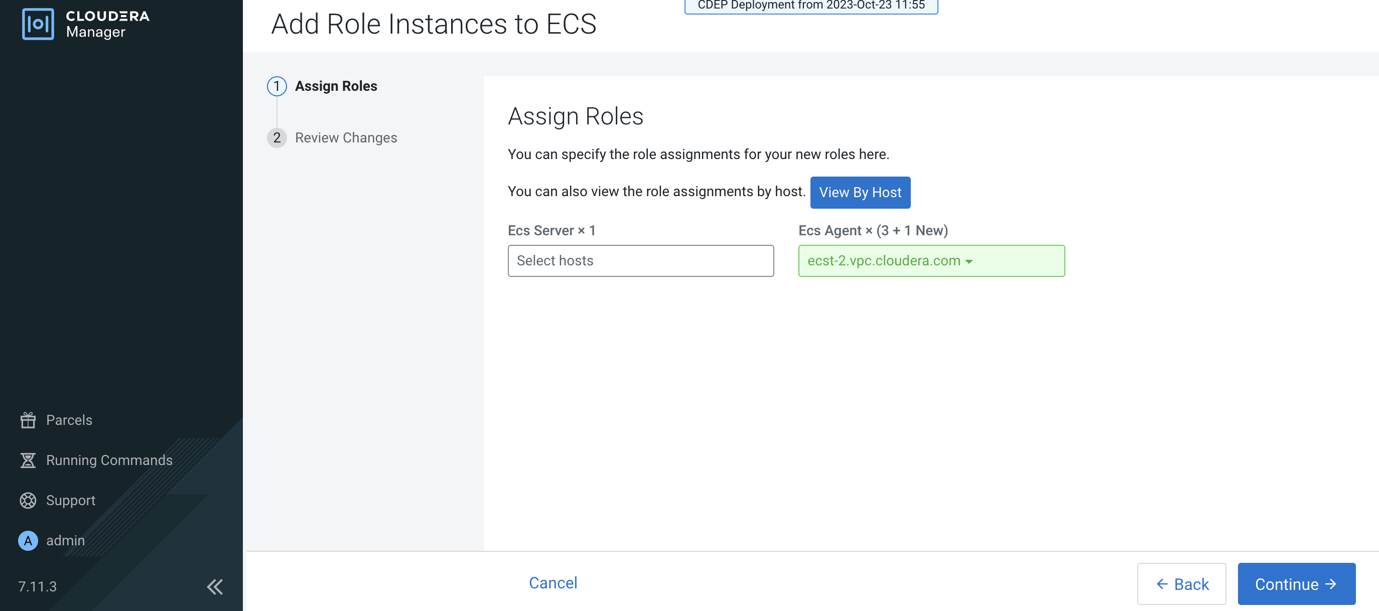 After you have finished specifying the ECS hosts, click Continue.
