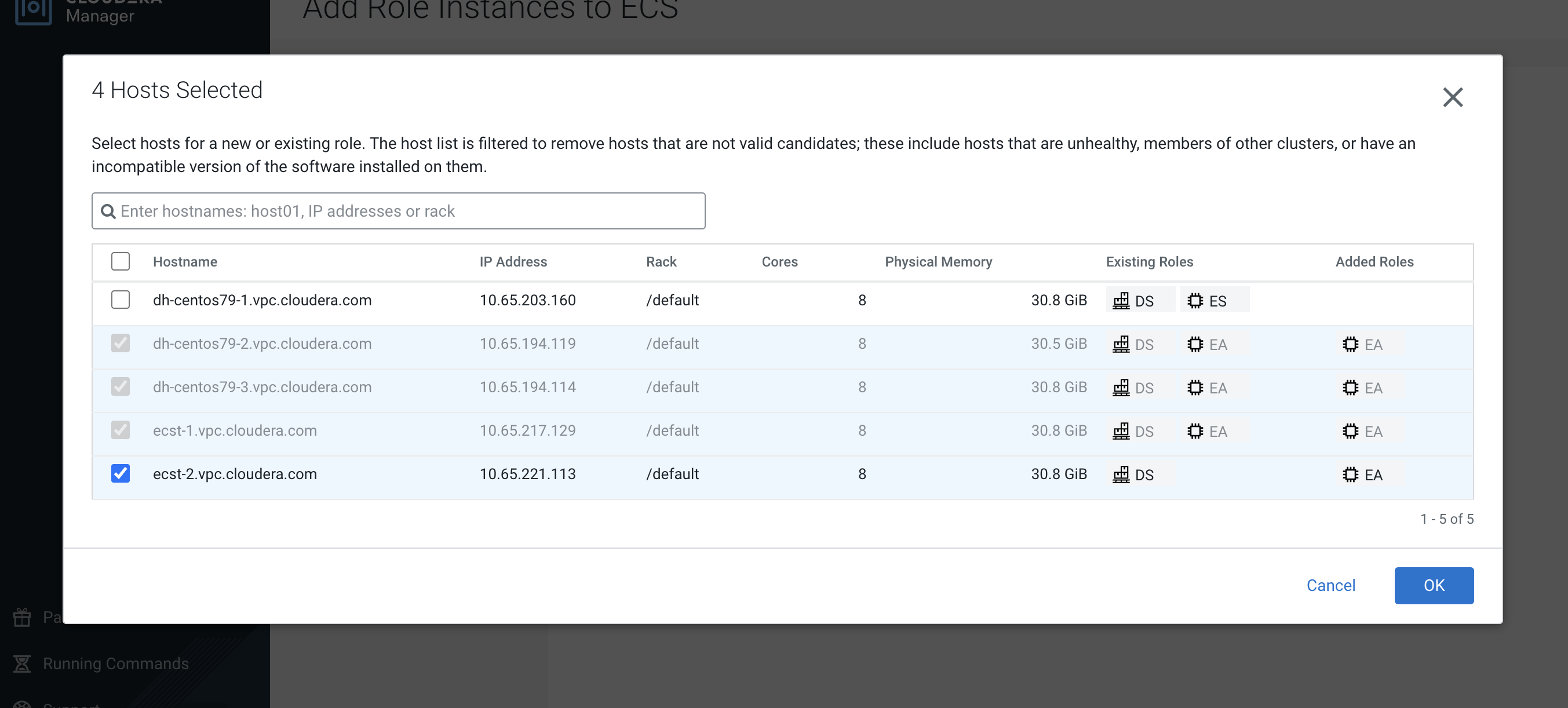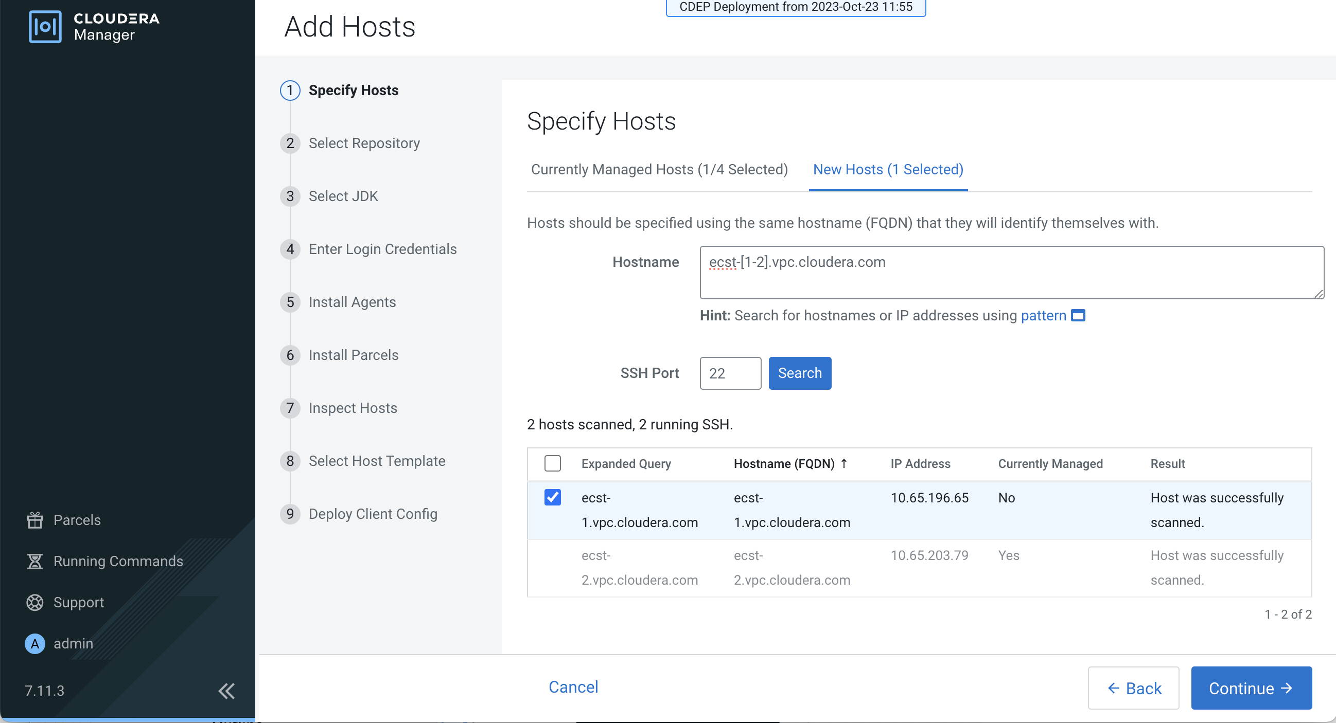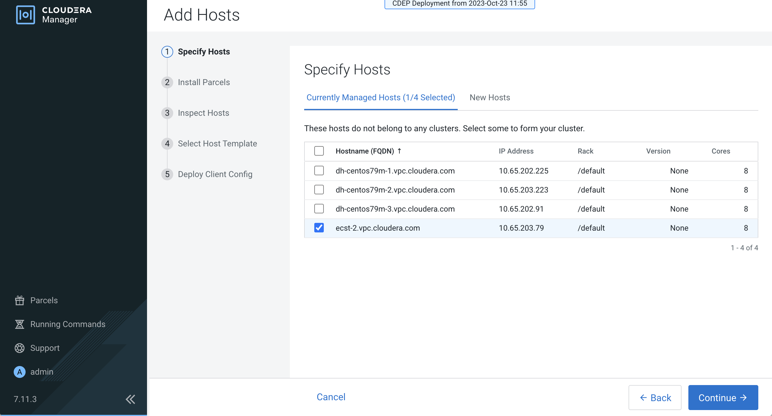 On the Specify Hosts page, hosts that have already been added to Cloudera Manager are