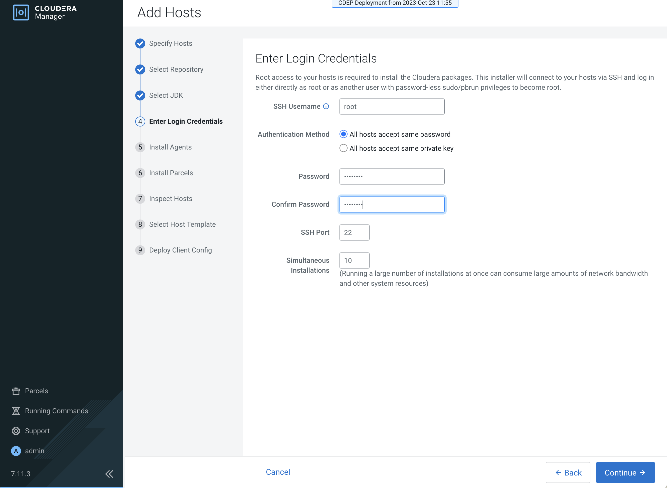 The Cloudera Manager agents are installed, and then the Install Parcels page appears.
