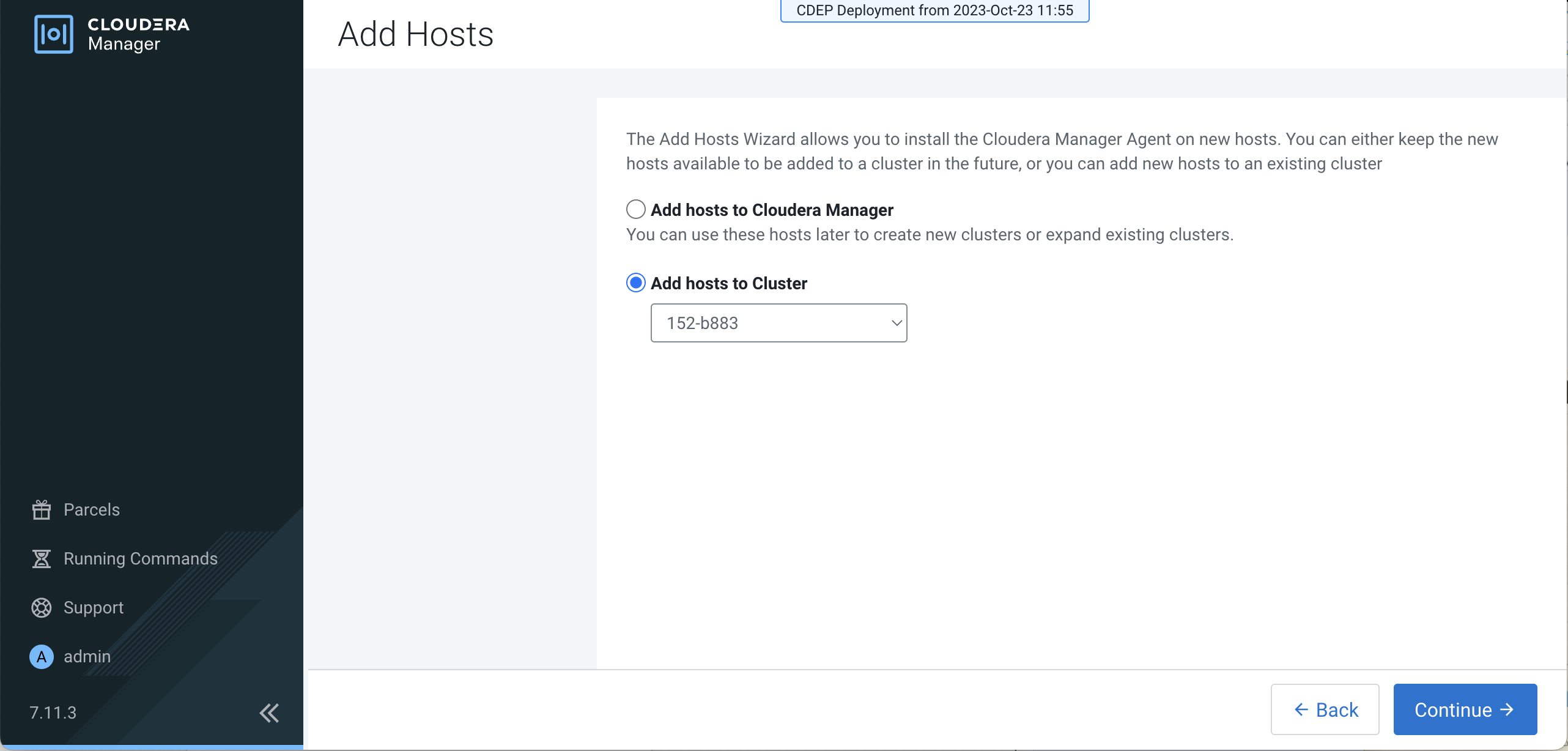 On the Add Hosts page, click Add Hosts to Cluster and select the