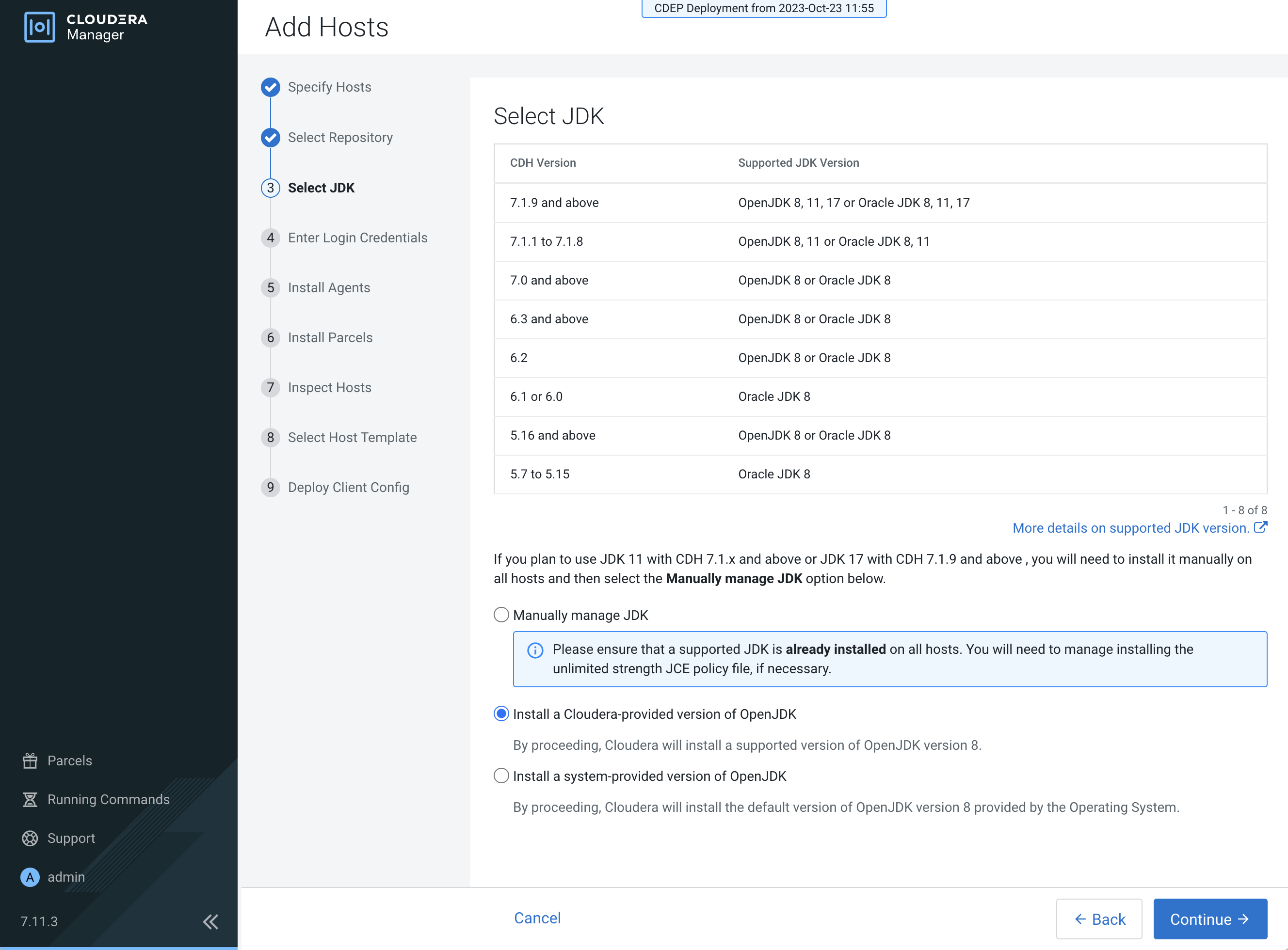Select a JDK option on the Select JDK page, then click Continue.
