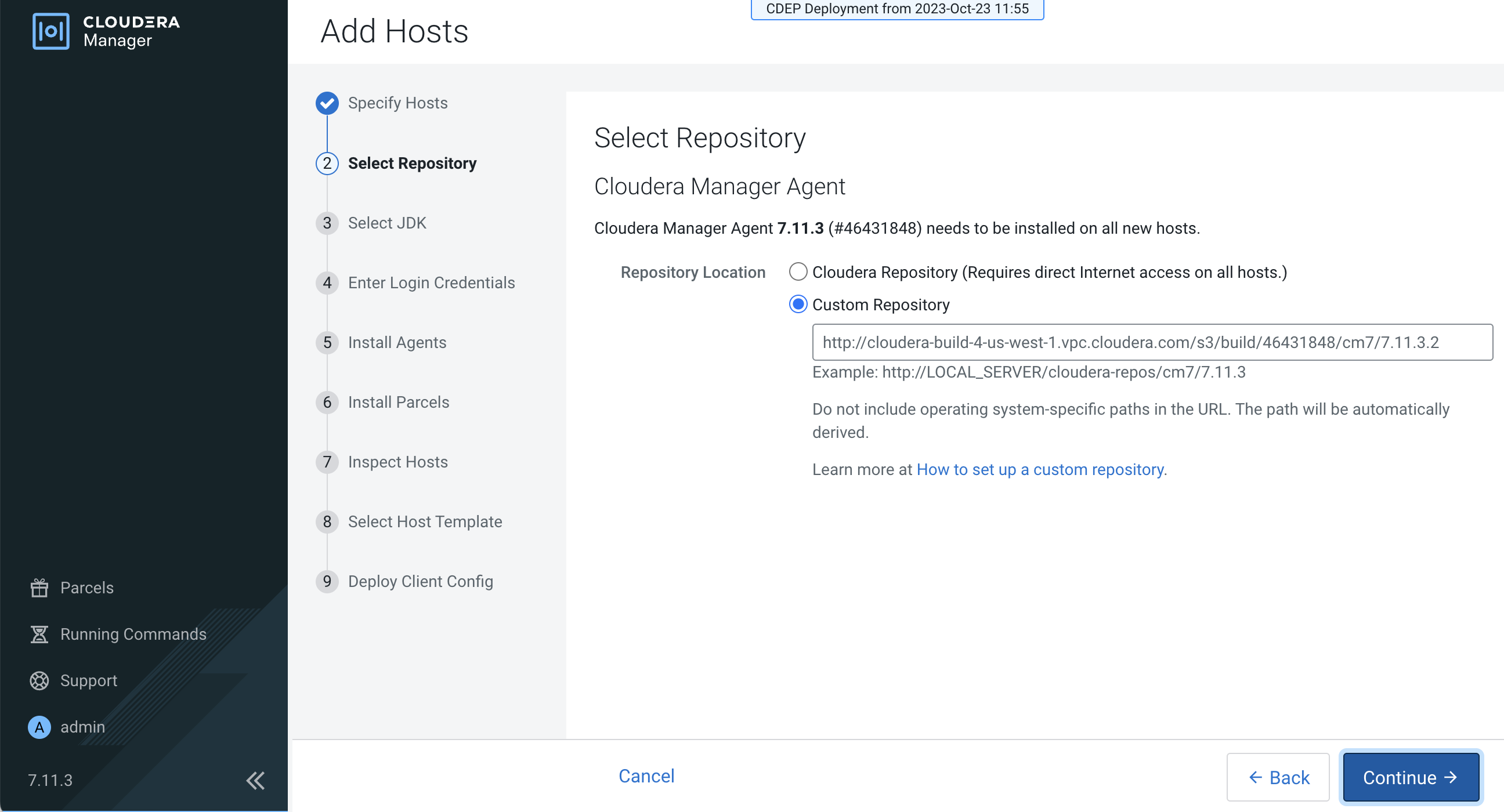 On the Select Repository page, the applicable Cloudera Manager Agent repository