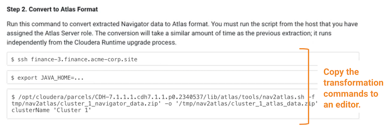 To complete the Navigator-to-Atlas migration outside of the Cloudera Runtime upgrade, see Transitioning Navigator data using customized scripts.
