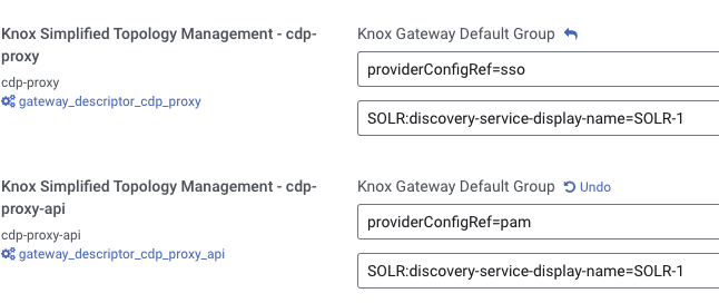 Knox Simplified Topology Management - cdp-proxyandKnox Simplified Topology Management - cdp-proxy-api. This is to avoid Knox forwarding requests to the wrong Solr instance. If the only Solr instance in your cluster is the one dedicated to Ranger, skip this step.Provide the workload Solr service name in the