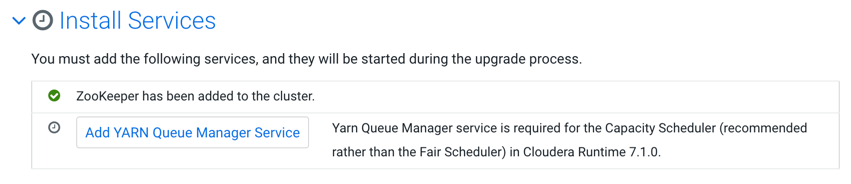 If you are upgrading a cluster that has the Hive service, you will be prompted to add the Tez, Zookeeper, Hive on Tez, and YARN QueueManager services. -