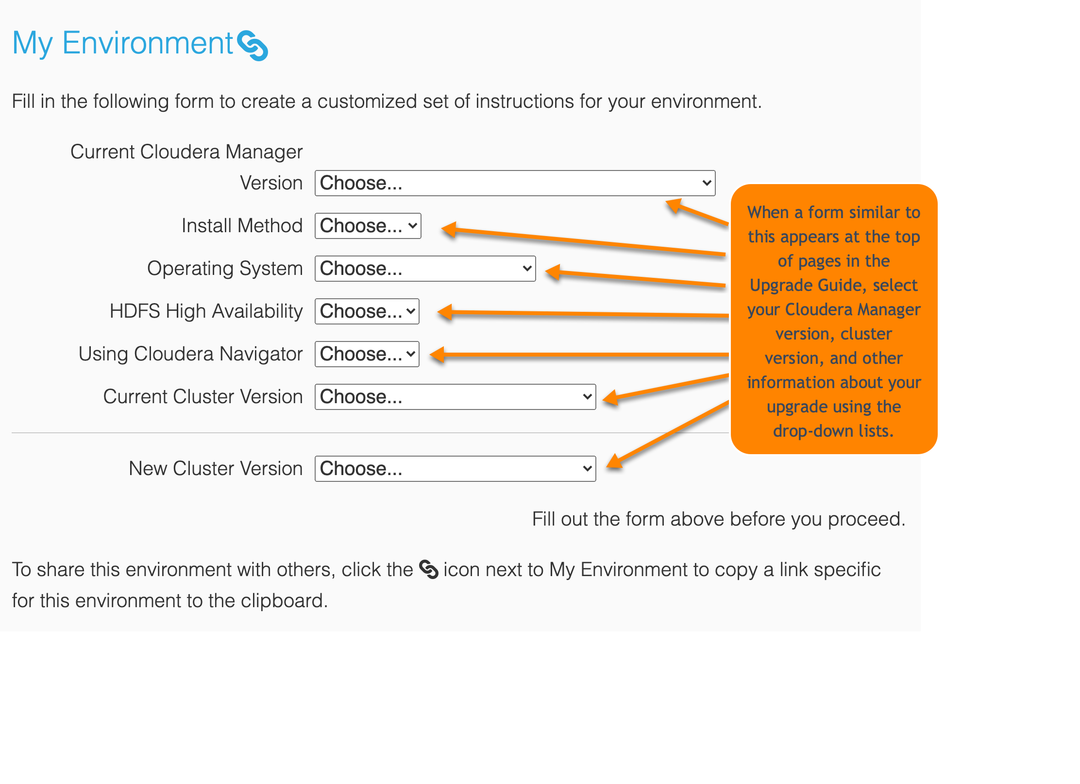 This online version of the Cloudera Upgrade Guide allows you to create a customized version of the guide on many pages that only includes the steps required for your upgrade. Use the My Environment form at the top of pages in this guide to select the Cloudera Manager, CDH or Cloudera Runtime version for your upgrade as well as the operating system version, database type, and other information about your upgrade. After making these selections, the pages in the guide will only include the required steps for your upgrade. The information you enter is retained on each page in the guide.