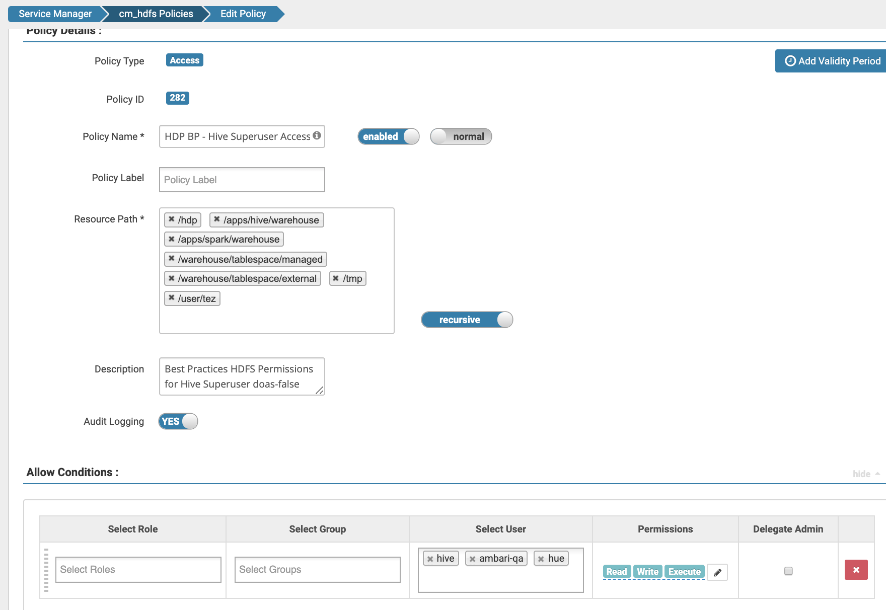 The new service account is Hue. You must add the Hue user to the policies defined that hold Hive as the superuser. If there is no policy in Ranger defining Hive as a superuser across key directories in HDFS, then you are using impersonation. Impersonation is no longer the standard or recommended. Consult the Cloudera team for details.