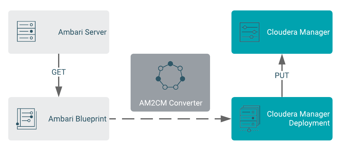 The purpose of this tool is to convert the Ambari blueprint to Cloudera Manager Deployment template. Download and export the Ambari blueprint to the AM2CM tool. The AM2CM tool converts the Ambari blueprint to Cloudera Manager Deployment template. Import the converted template to Cloudera Manager, start the services through the Cloudera Manager UI, and validate the cluster.