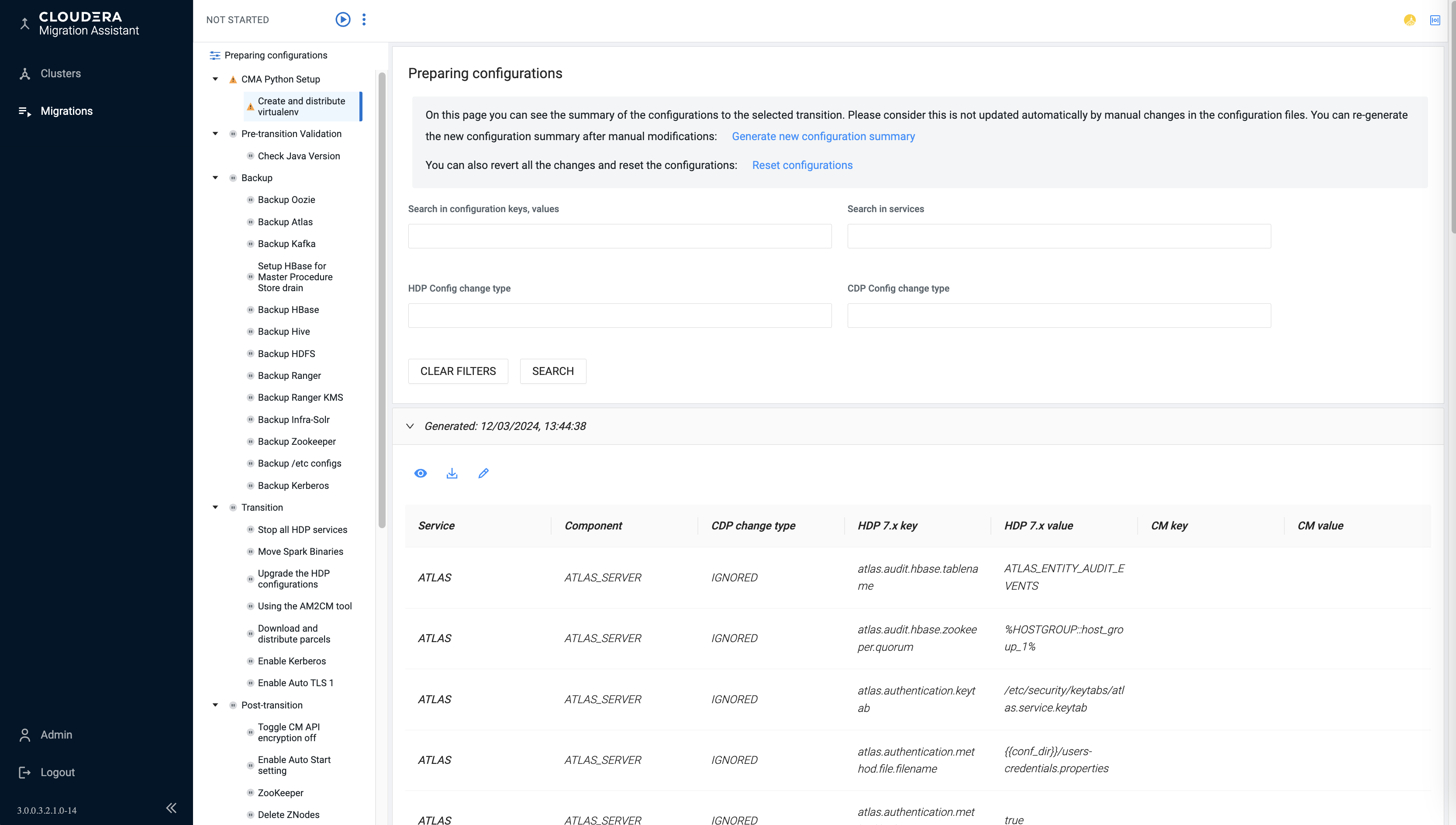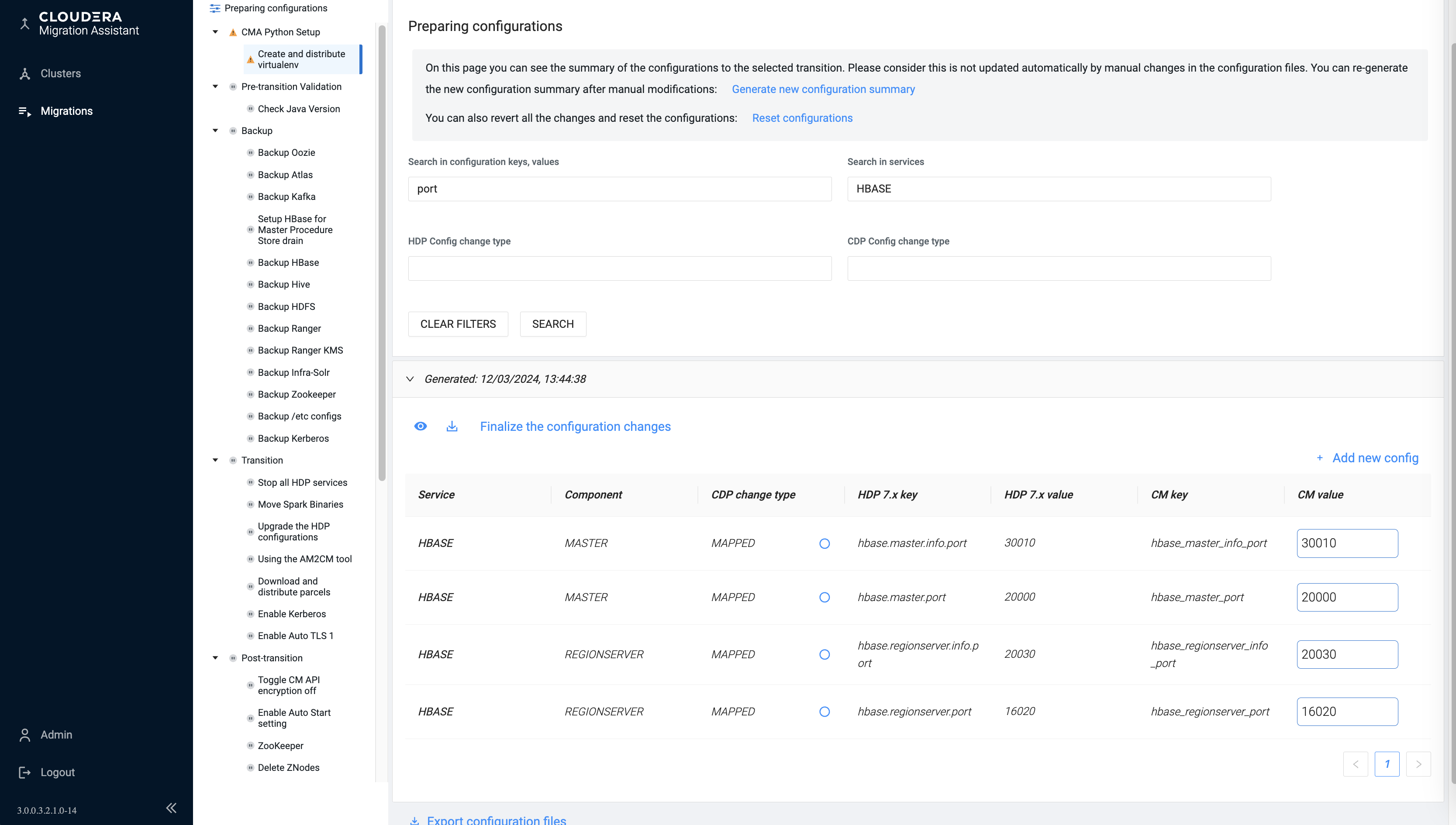 - You can edit the mapping rules and generate a new configuration summary with changes. You can try multiple settings before mapping the HDP parameters to CDP. You can export the configurations to a CSV file, share with others, and reset the mapping rules to default and start again.