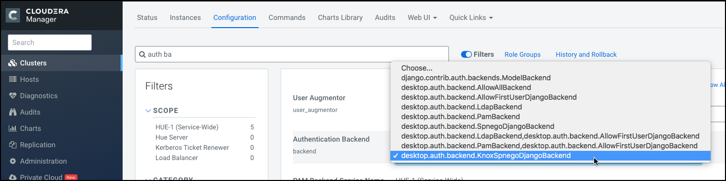 - Go to Clusters > $Hue service > Configurations and search for the Authentication Backend field.