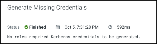 Role is missing Kerberos keytab. Go to the Kerberos Credentials page and click the Generate Missing Credentials button. - Click Administration on the Cloudera Manager left navigation panel and select Security.