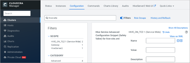 1. In > Clusters select the Hive on Tez service. Click Configuration, and search for hive-site.xml.