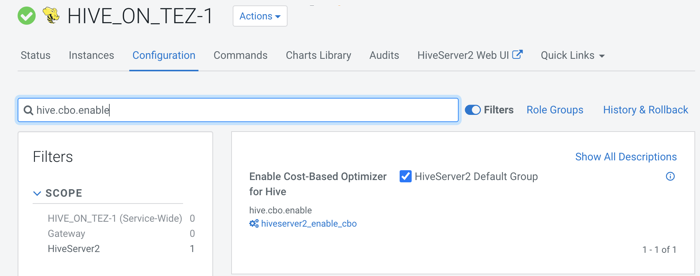 2. In the Configuration page, search for the hive.cbo.enable property.