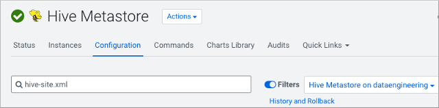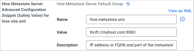 In addition to the database properties you need to set in CDP Private Cloud Base, you must configure the metastore URI property. This property defines one or more metastore locations.