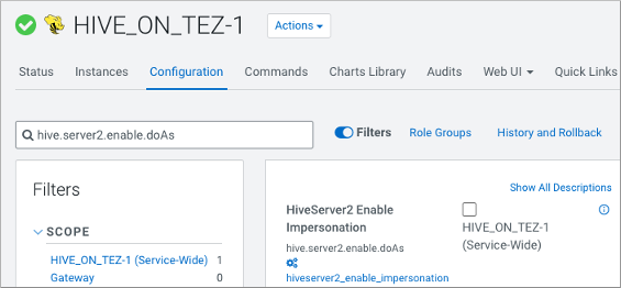 In Cloudera Manager, click and search for (hive.server2.enable.doAs).