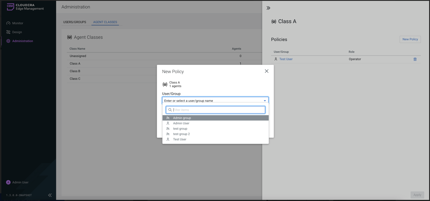 Select a user or user group for the agent class.
