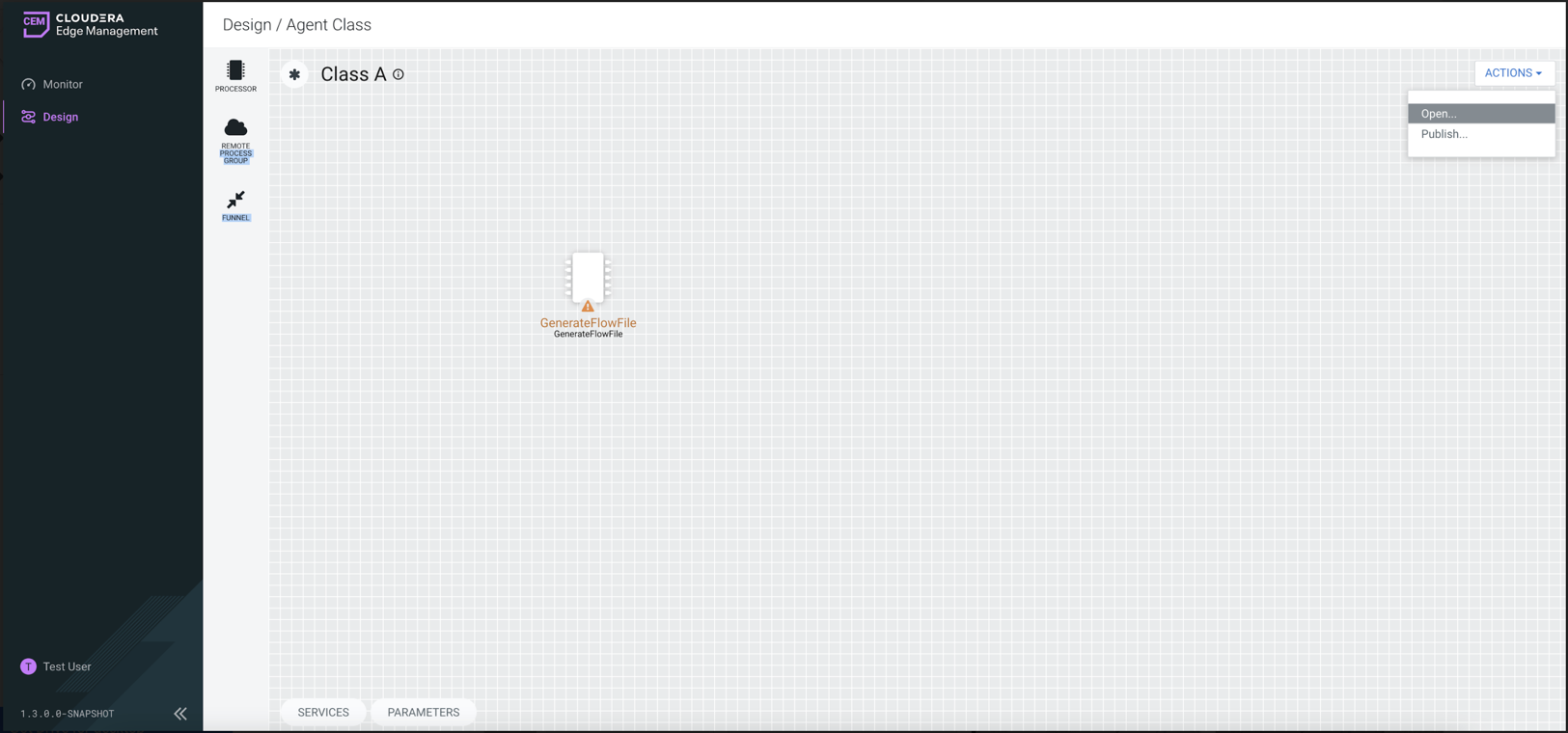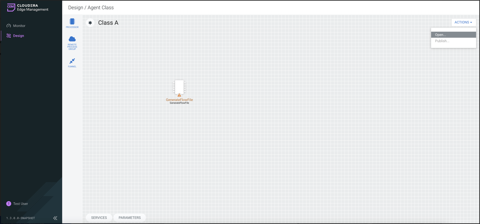 Operator can monitor events and publish the design without editing it for the given agent class and is able to modify flow and parameter mappings.