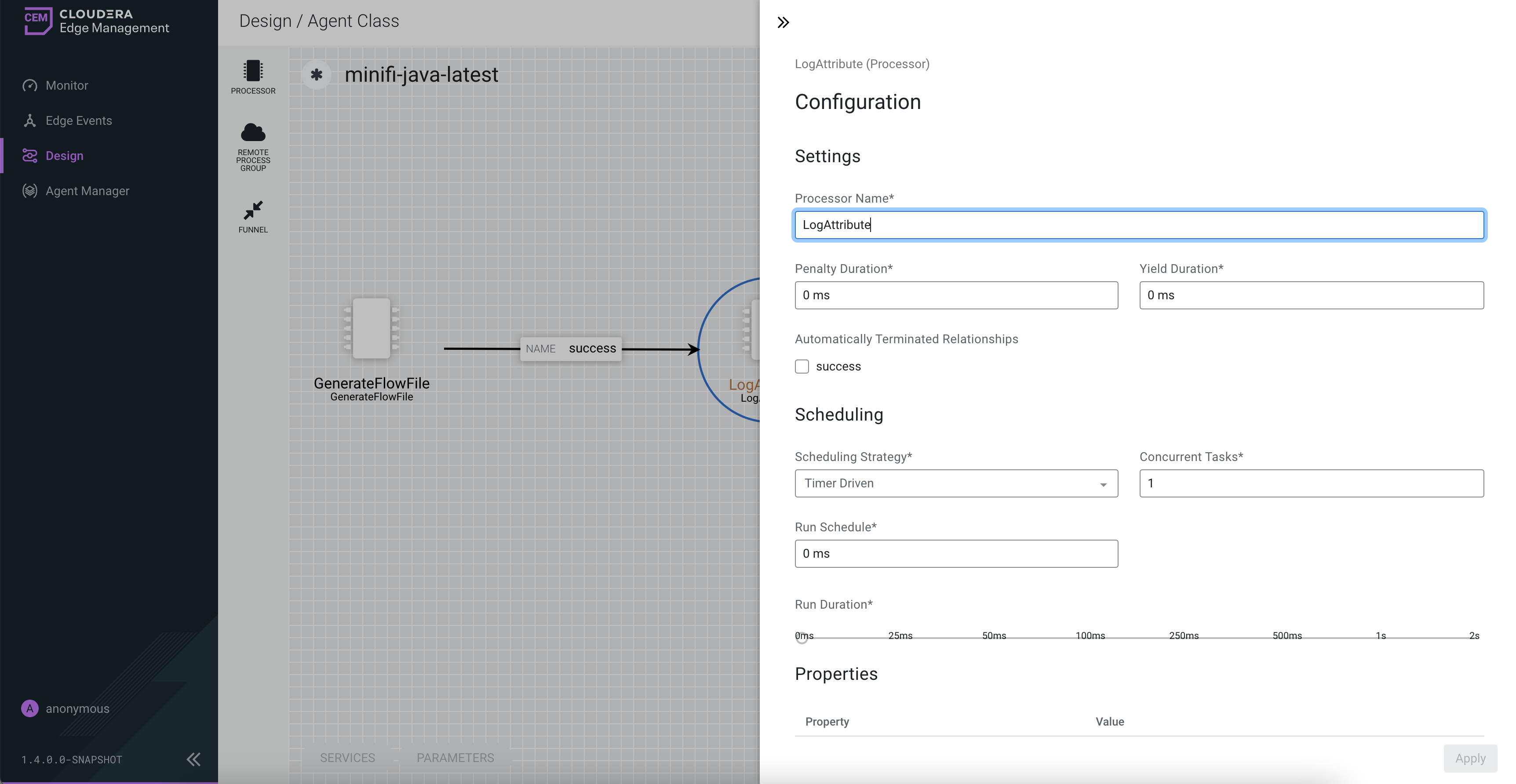 The example dataflow consists of just two processors: GenerateFlowFile and LogAttribute. These processors are normally used for testing, but they can also be used to build a ReadyFlow and see Cloudera Edge Management (CEM) in action.