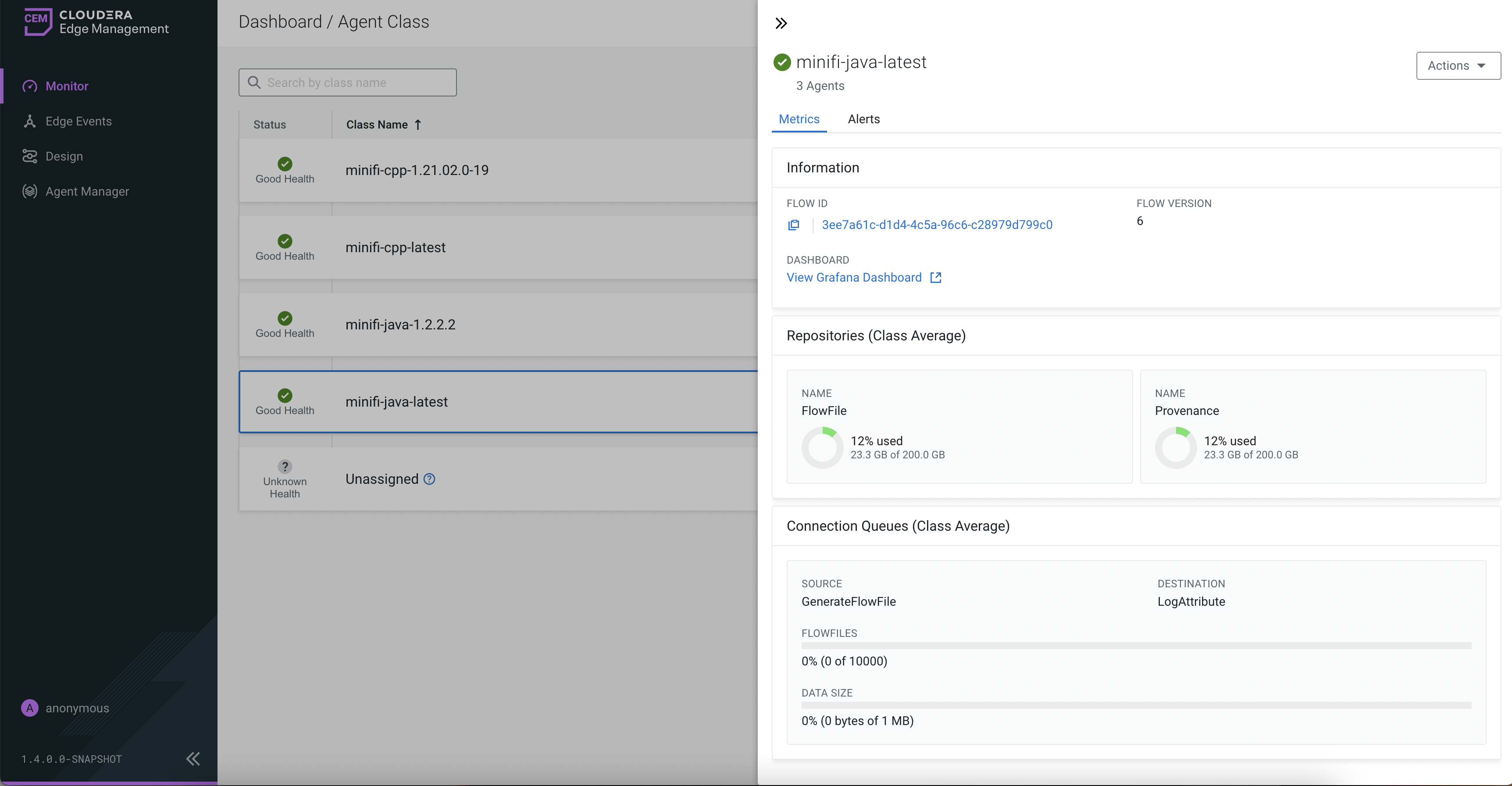 This section displays details about the class including flow ID, latest flow version, and Grafana dashboard link if you enabled it. For more information, see Monitoring Metrics with Grafana.