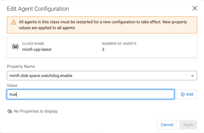 You can see that property update is possible only on class level (not individual agent level). This is because Cloudera wants to enforce configuration consistency between the agents under the same agent class. To read about how to view a specific agent’s configuration, see Configuration tab section in Agent details in CEM.