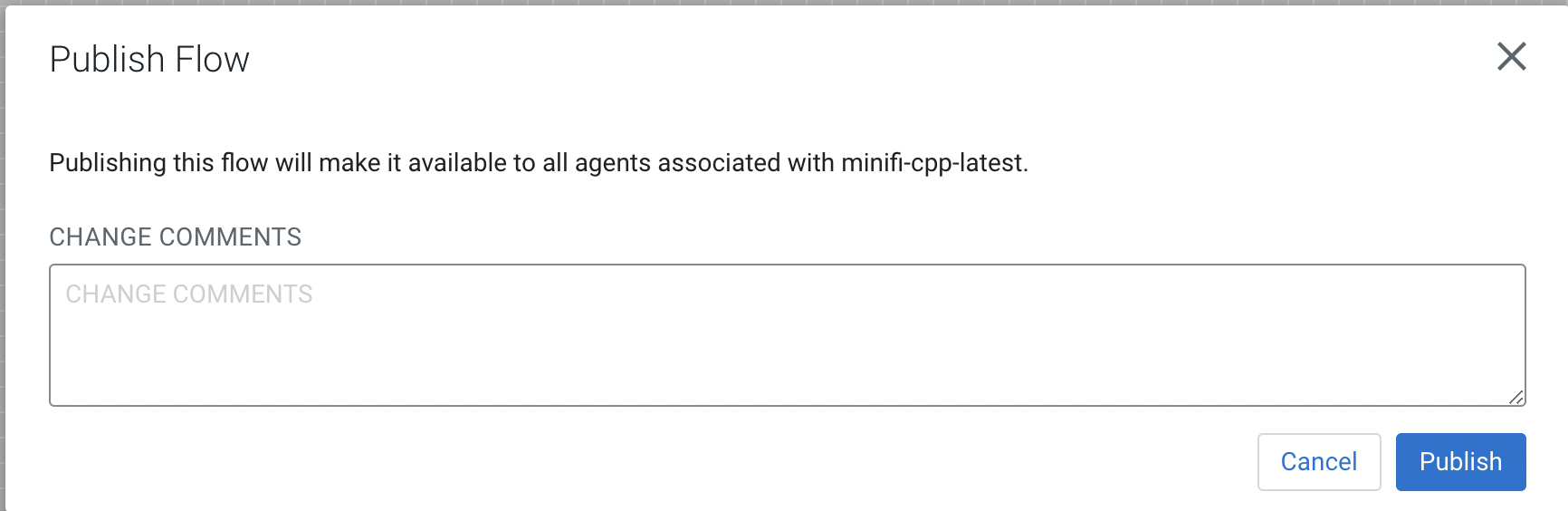 Publishing a dataflow in CEM Learn how to publish a dataflow using the Cloudera Edge Management (CEM) UI. To publish a dataflow and make it available to all agents associated with its class, select Publish from the ACTIONS drop-down menu on the canvas. The Publish Flow dialog appears as shown in the following image: Enter comments if desired, and click Publish. The flow status changes from modified () to current ().