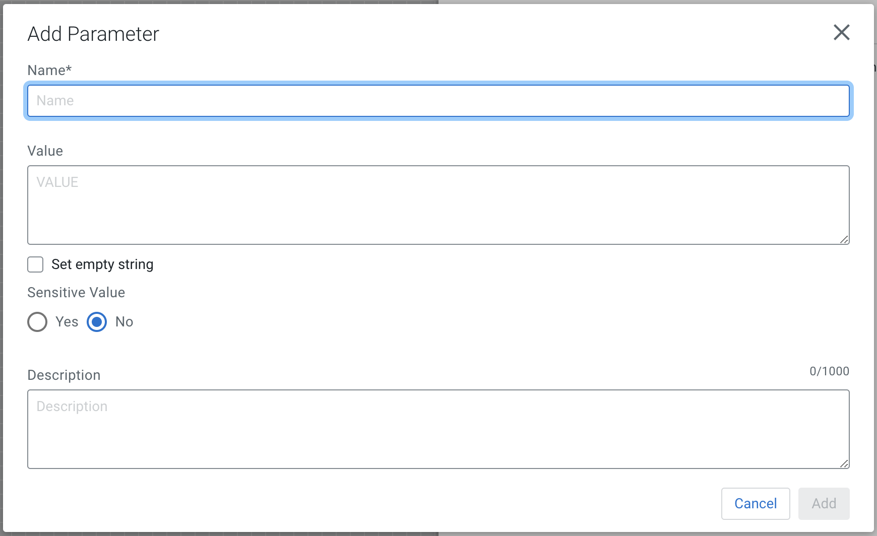 Property Description Name Enter a name that is used to denote a parameter. Only alpha-numeric characters (a-z, A-Z, 0-9), hyphens ( - ), underscores ( _ ), periods ( . ), and spaces are allowed. Value Enter a value that is used when the parameter is referenced. Parameter values do not support Expression Language or embedded parameter references. Set empty string Select the checkbox to set parameter value to an empty string. Sensitive Value Set whether the parameter value should be considered sensitive. If so, the value of the parameter is not shown in the UI once applied. Once you create a parameter, its sensitivity flag cannot be changed. Description Enter a description that explains what the parameter is for. This field is optional. - Click Add button to add the parameter.