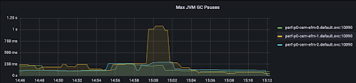 The heap consumption fluctuates between 2.3 GB and 7.5 GB with maximum Garbage Collection (GC) pauses of 200 ms sometimes peaking up to 1 second.
