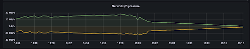 Accumulated in-bound network traffic is between 20 and 30 MB/s. Compared to the baseline test case, there is 60-75% less pressure on the network I/O.