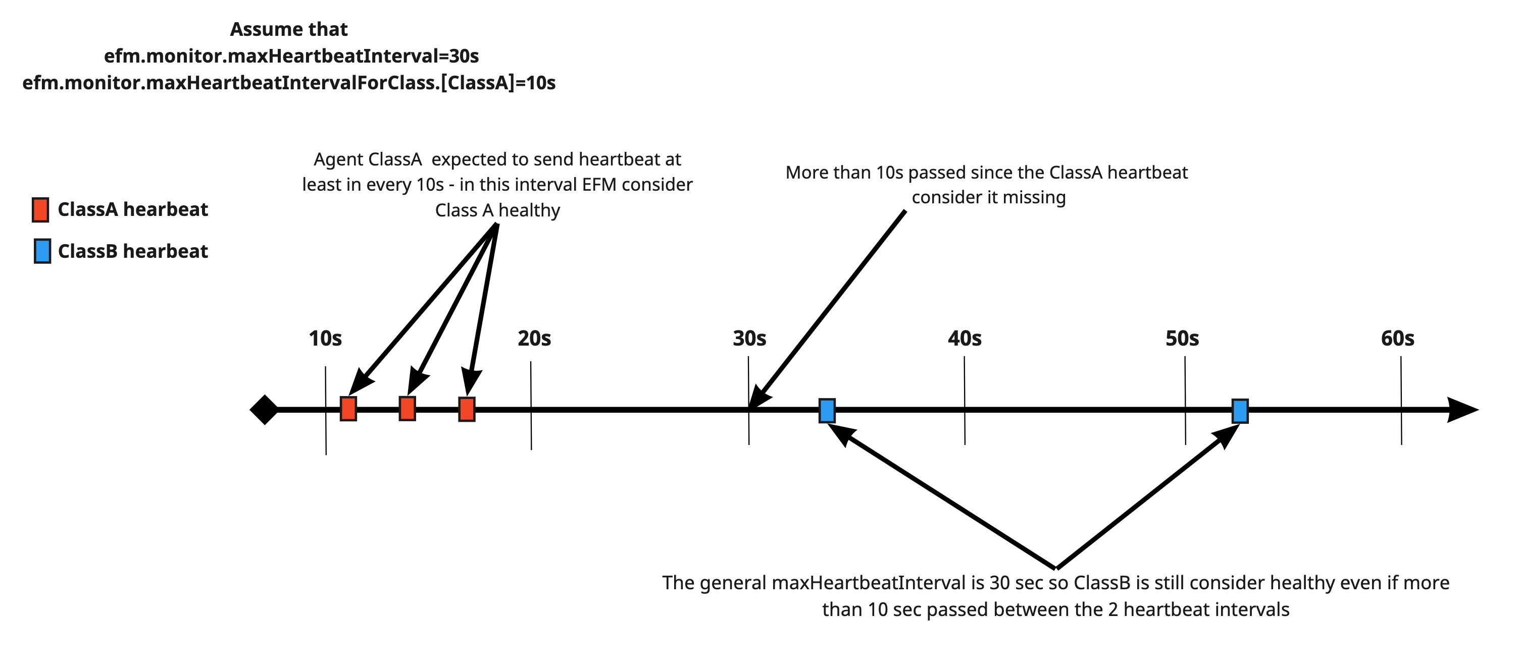 efm.monitor.maxHeartbeatIntervalForClass.[ClassA]=10sThe following chart shows you how EFM considers an agent healthy based on these settings:
